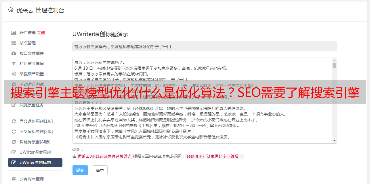 所谓优化算法,其实是指:利用海量数据进行分析和监控,不断探索相关规则的边界,建立搜索引擎的定义特征模型,使目标页面更符合搜索引擎的排名机制.