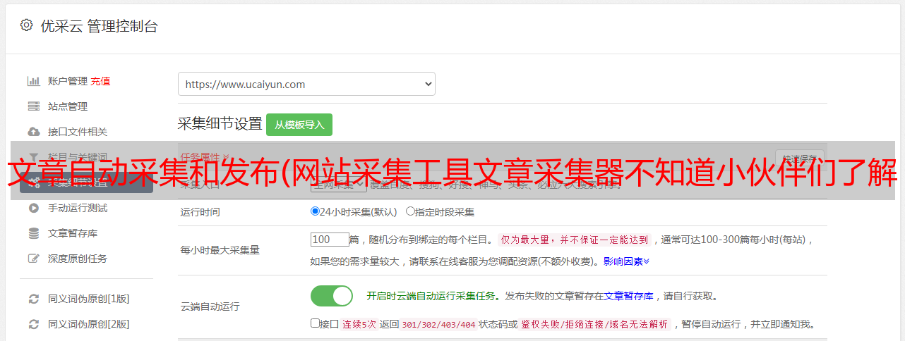 1、按 关键词采集文章 而不写 采集 规则。自动全网采集,覆盖六大搜索引擎。自动过滤内容相关度和文章平滑度,只有采集高度相关和平滑度文章。图片自动匹配,智能伪原创,定时采集,自动发布,自动提交到搜索引擎,支持各种cms和站群程序。采集任务每天定时定量完成!您只需要设置必要的参数即可实现高质量的全托管无人值守自动更新文章。