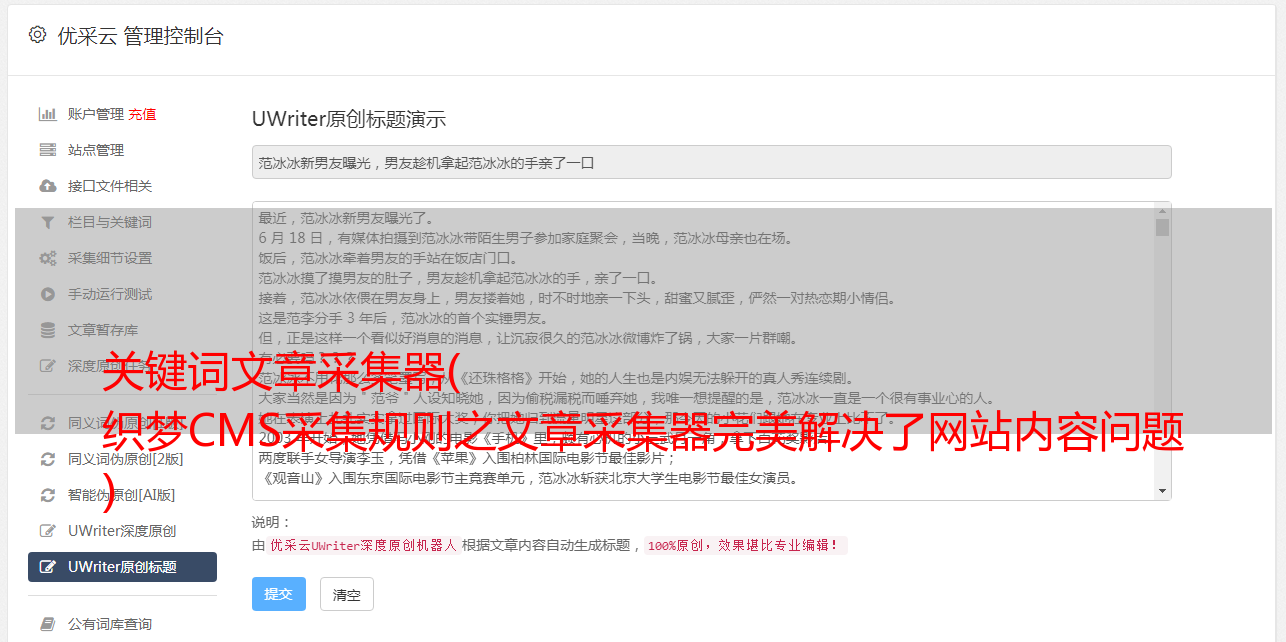 多种伪原创和优化方法来提高收录率和关键词排名:自动标题、段落重排、高级混淆、自动内部链接、内容过滤、URL过滤和同义词替换等方法提升采集文章原创性能,提升搜索引擎收录、网站权重和关键词排名。