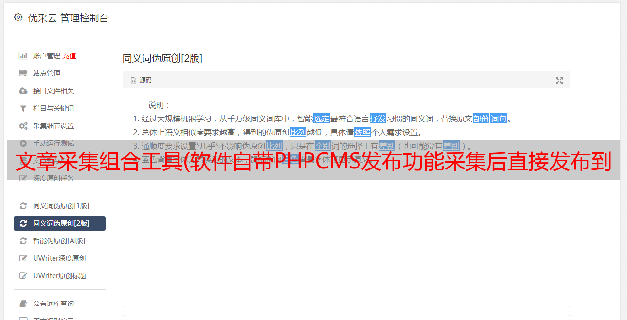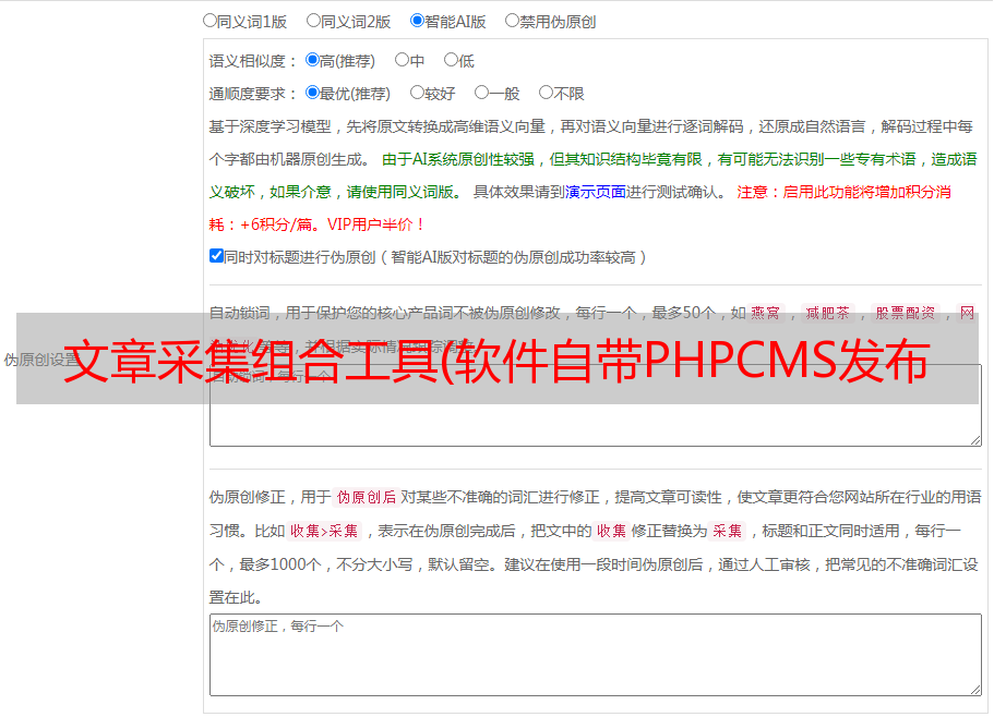 3、软件自带PHPcms发布功能采集直接发布到网站,配置每日总发布量,是否为伪原创,还为站长工作人员配备了强大的SEO功能(自动内链、标题插入关键词、内容插入关键词、随机作者、随机阅读等增强SEO优化功能,从而提高网站收录!) 它还支持在 PHPcms 以外的主要 cms 平台采集 上发布。