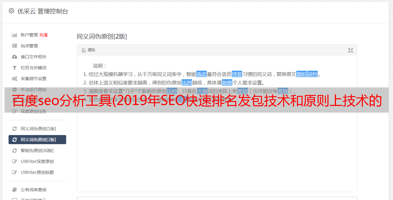 优采云 发布时间: 2022-01-14 01:36百度seo分析工具(2019年SEO快速排名发包技术和原则上技术的神秘面纱)