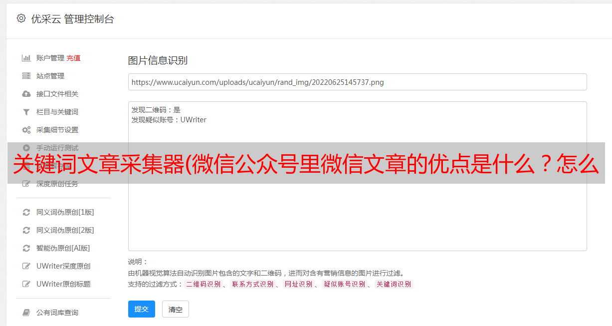 可以批量粘贴关键词进行搜索,选择采集内容日期,可以识别标题和内容伪原创,识别文章是否为原创,支持< @k7@ >一份分发给网站