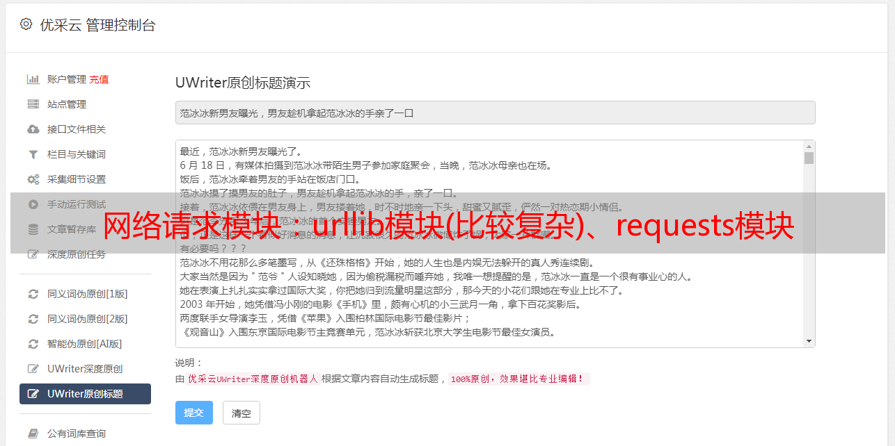 优采云 发布时间: 2021-04-25 20:03网络请求模块:urllib模块(比较复杂)、requests模块