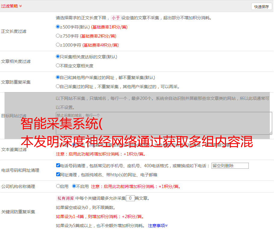 此外,本发明提供一种互联网信息人工智能采集系统,包括:网页采集模块,用于采集互联网或大数据平台数据,提取所需文章、新闻、帖子或微博数据,通过深度神经网络重新学习;
