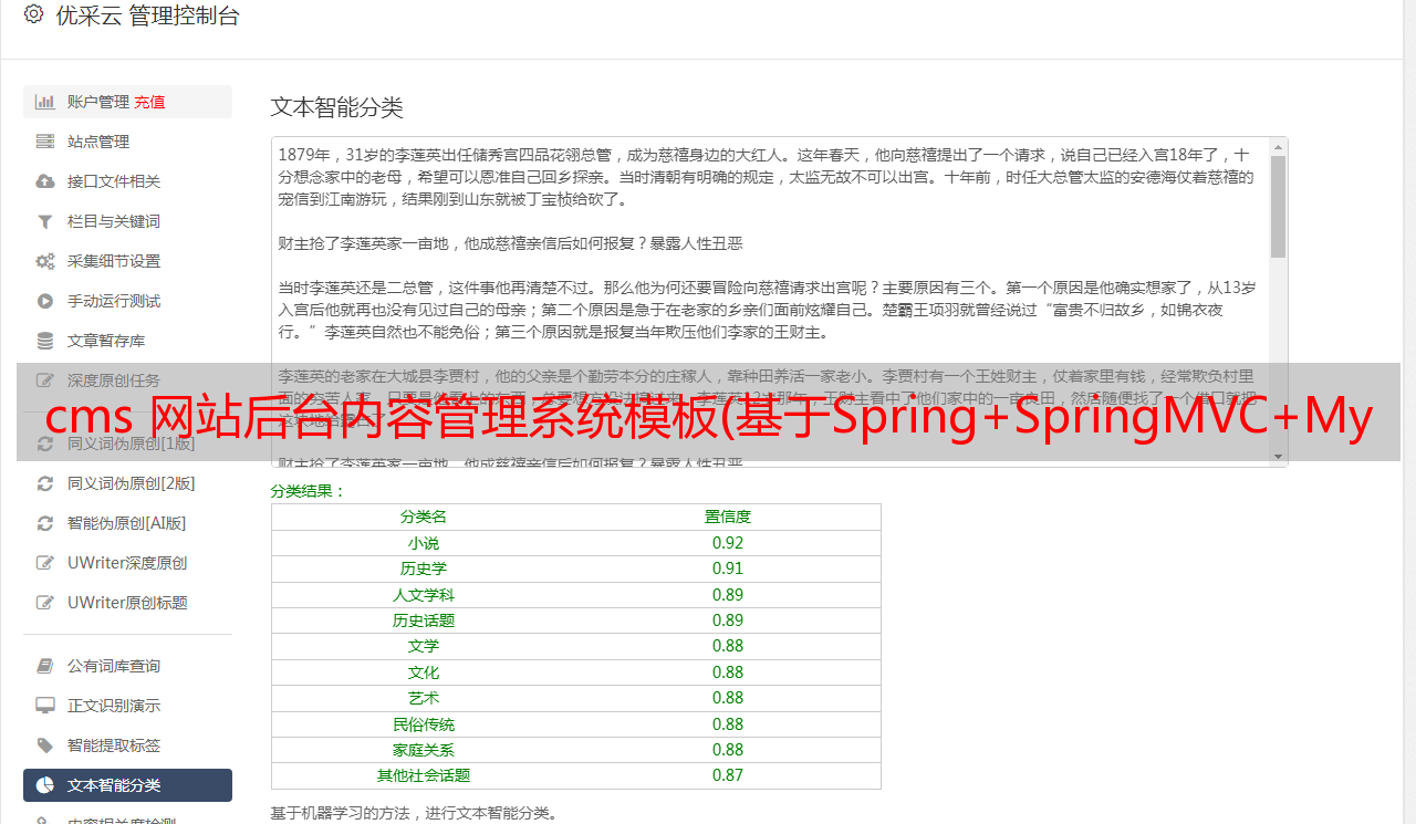 内容管理系统:支持多标签、多分类、强大的评论内容管理,具备基本的单页展示、菜单管理、系统设置等功能。