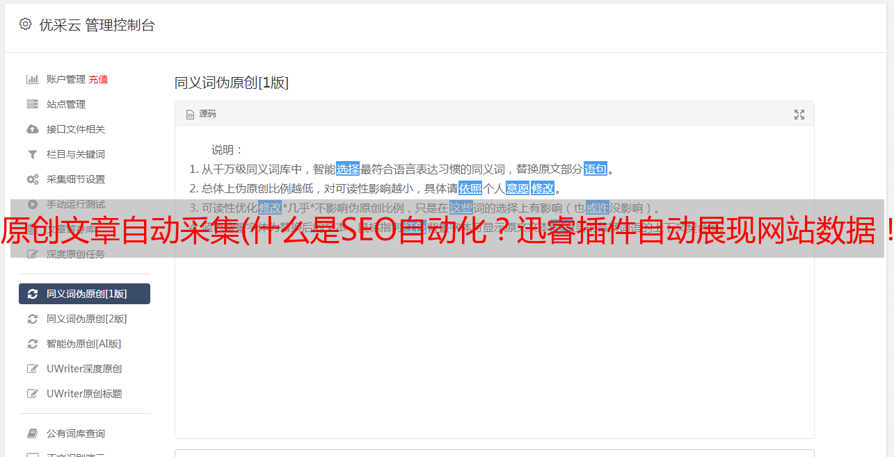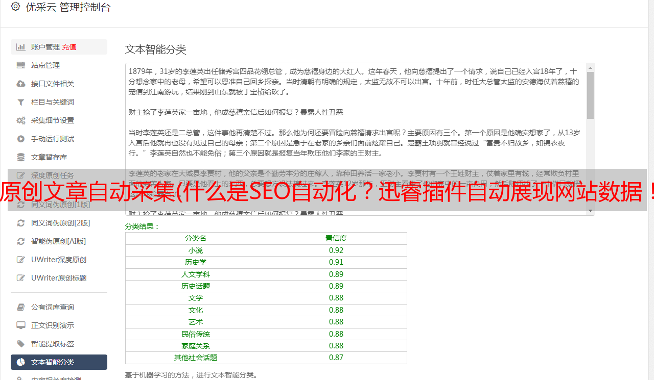 优采云 发布时间: 2022-01-19 07:18原创文章自动采集(什么是SEO自动化?迅睿插件自动展现网站数据!