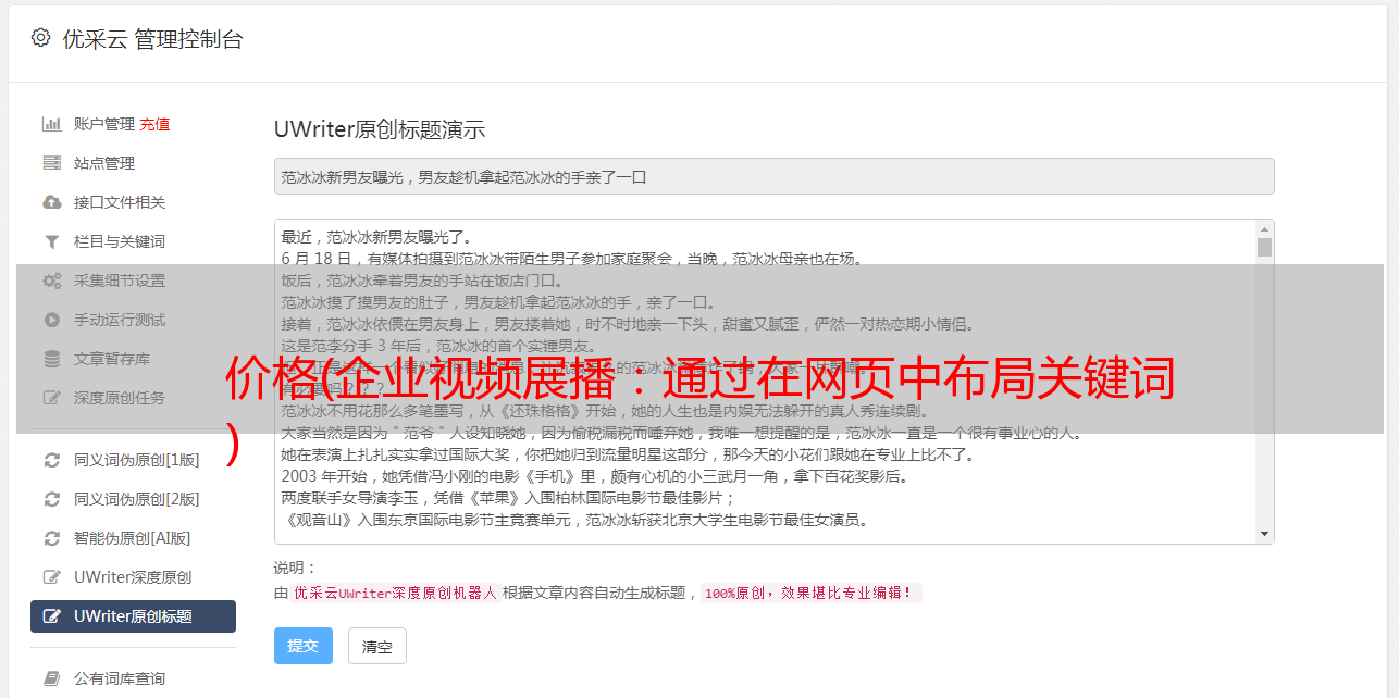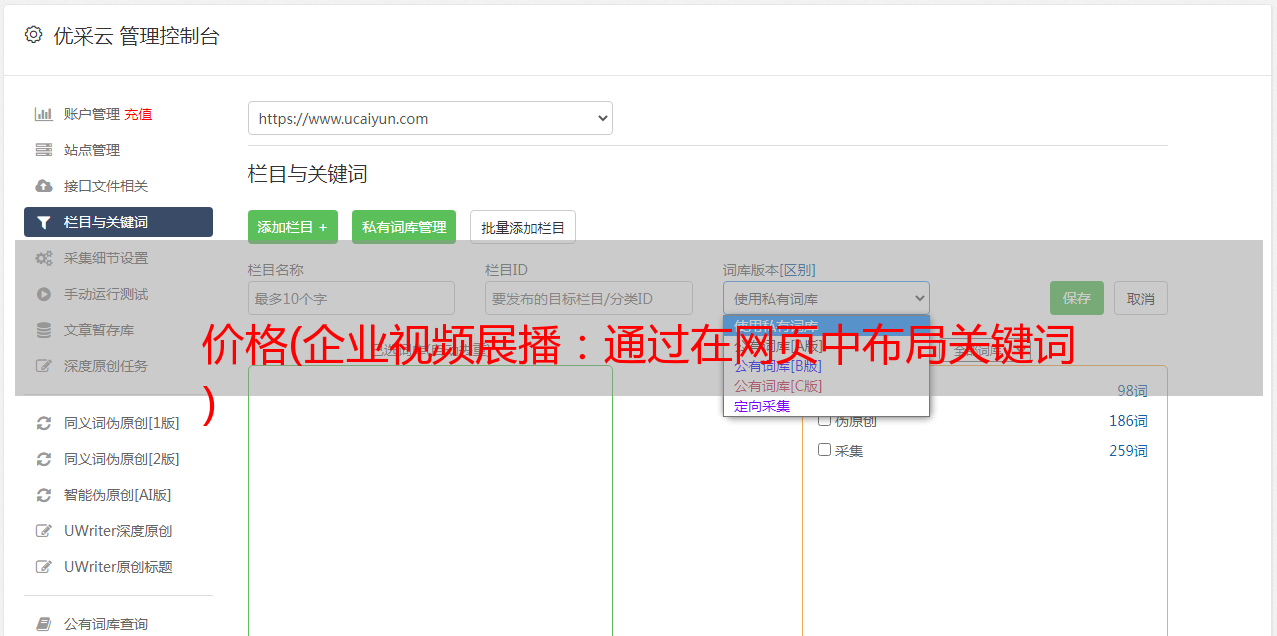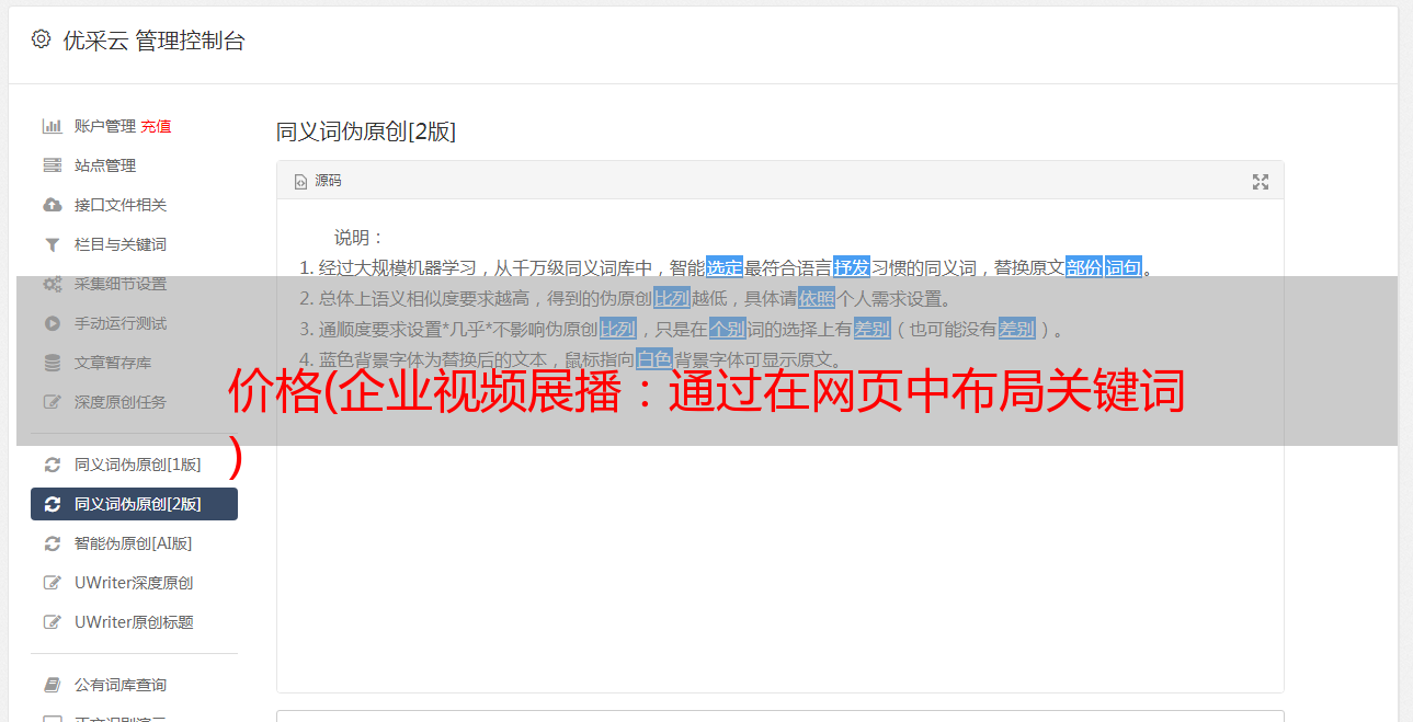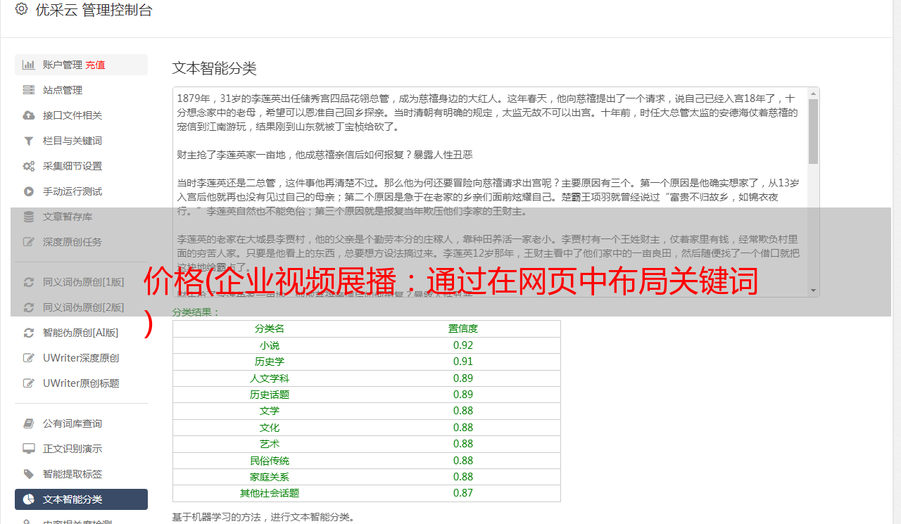 优采云 发布时间: 2022-01-19 22:08价格(企业视频展播:通过在网页中布局关键词