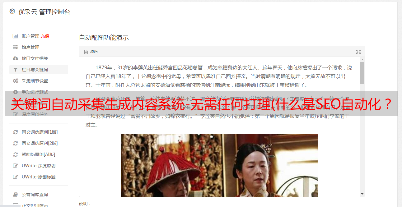优采云 发布时间: 2022-01-20 18:00关键词自动采集生成内容系统-无需任何打理(什么是SEO自动化?迅睿插件自动展现网站数据!