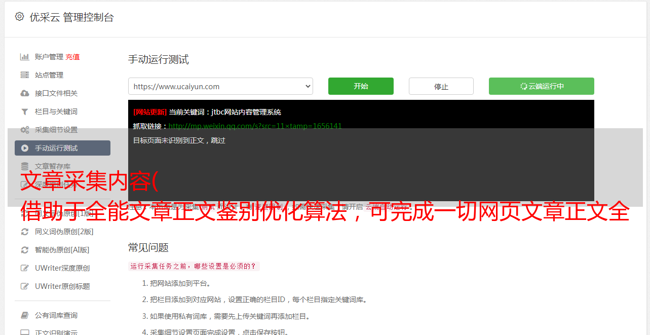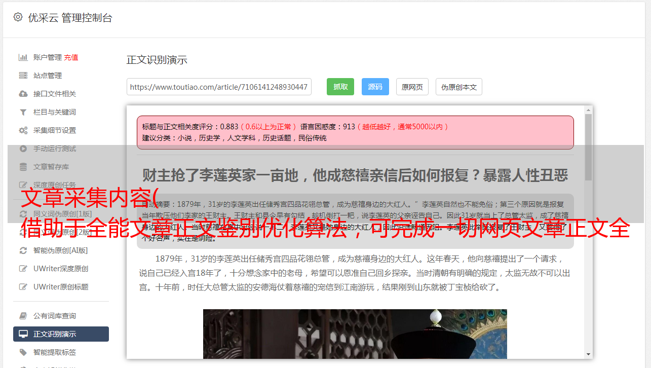 文章采集内容( 借助于全能文章正文鉴别优化算法,可完成一切网页文章正文全自动)