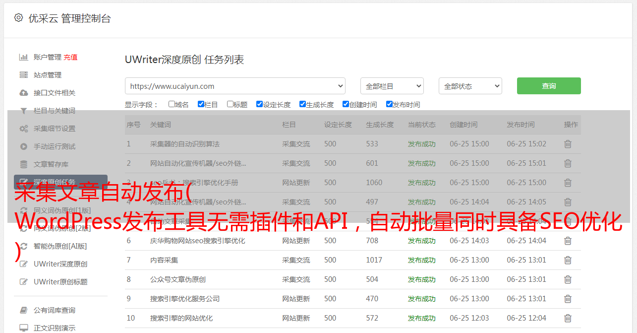 WordPress发布工具,无需插件和API,实现WPcms发布文章,自动批量SEO优化。WordPress发布可以实现网站自动采集和发布,即以量取胜的方式获得百度收录和关键词排名,从而获得被动搜索引擎交通。WordPress发布还配备了采集功能和自动伪原创,可以采集几乎所有类型的网页,无缝适配各类cms建站者,发布数据实时无需登录,实现定时定量自动采集发布,无需人工干预!就是站长网站管理,网站优化,大数据,云时代网站 数据自动化采集发布的SEO优化必备工具。更准确地说,WorePress 发布不仅仅是一个发布工具,它可以实现多个网站multiplecms同时同步管理,通过一个工具管理所有网站。各种网站cms都是我自己做的。利用工具的便利,我做的网站无论是收录还是排名效果都相当不错。