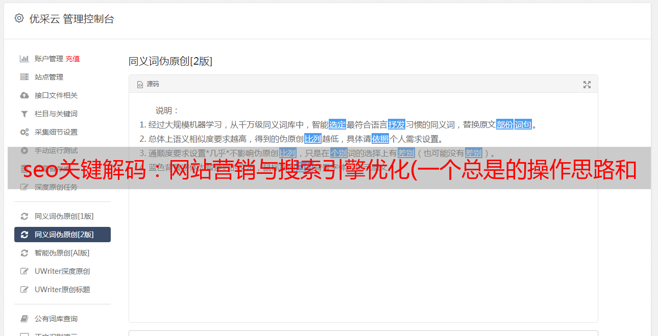 优采云 发布时间: 2022-01-22 14:06seo关键解码:网站营销与搜索引擎优化(一个总是的操作思路和方法和操作建议和技巧分享)