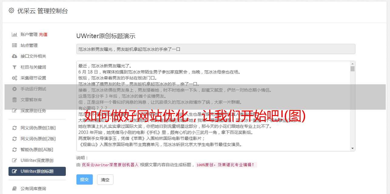 网站管理员应优化网站上的文字和图像以及所有内容。创建了唯一的原创标题,描述元标记和h1标头。别采集。最好不要发布只是要重新填充的文章。它必须是高质量的内容,即原创或伪原创。应该指出的是:原创不等于高质量。我在这里谈论的高质量是指可以满足用户需求的内容。即使是汇总和重新发布的内容,它也是可以满足用户需求的高质量内容。图片和文字