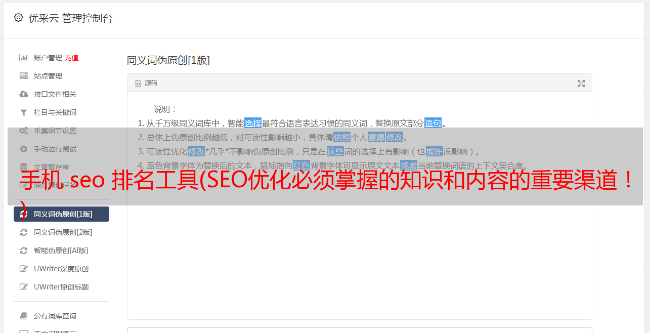 优采云 发布时间: 2022-01-23 03:12手机 seo 排名工具(SEO优化必须掌握的知识和内容的重要渠道!