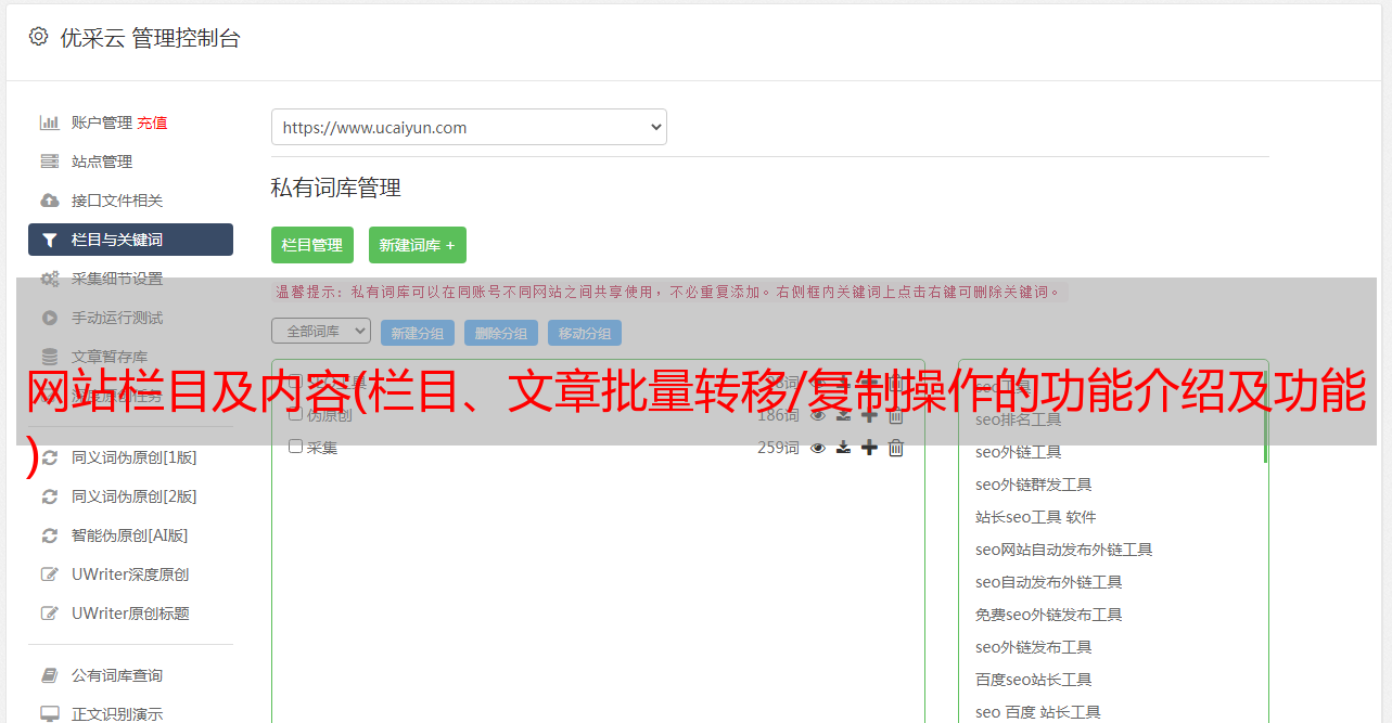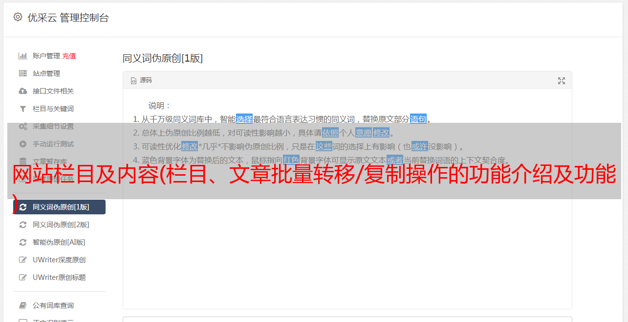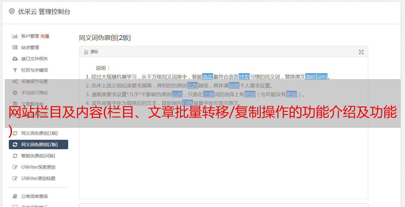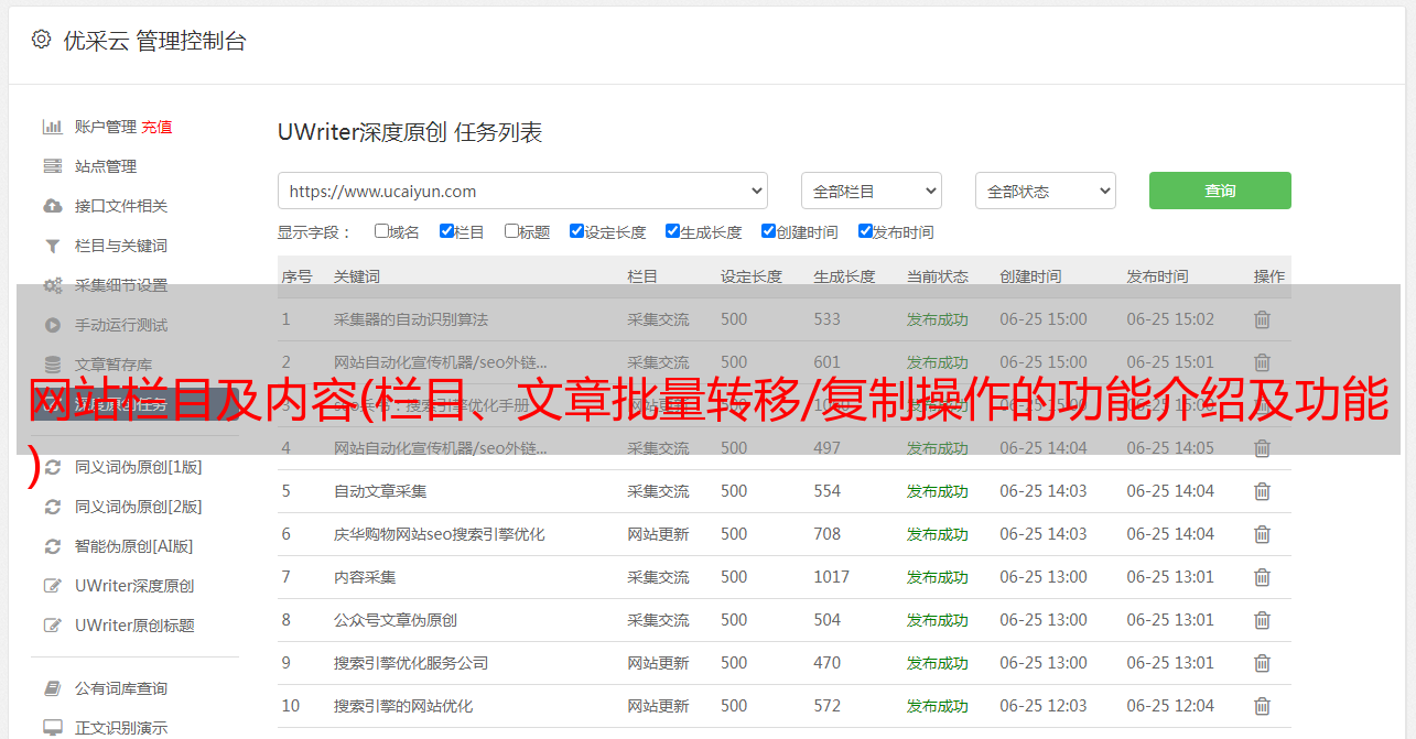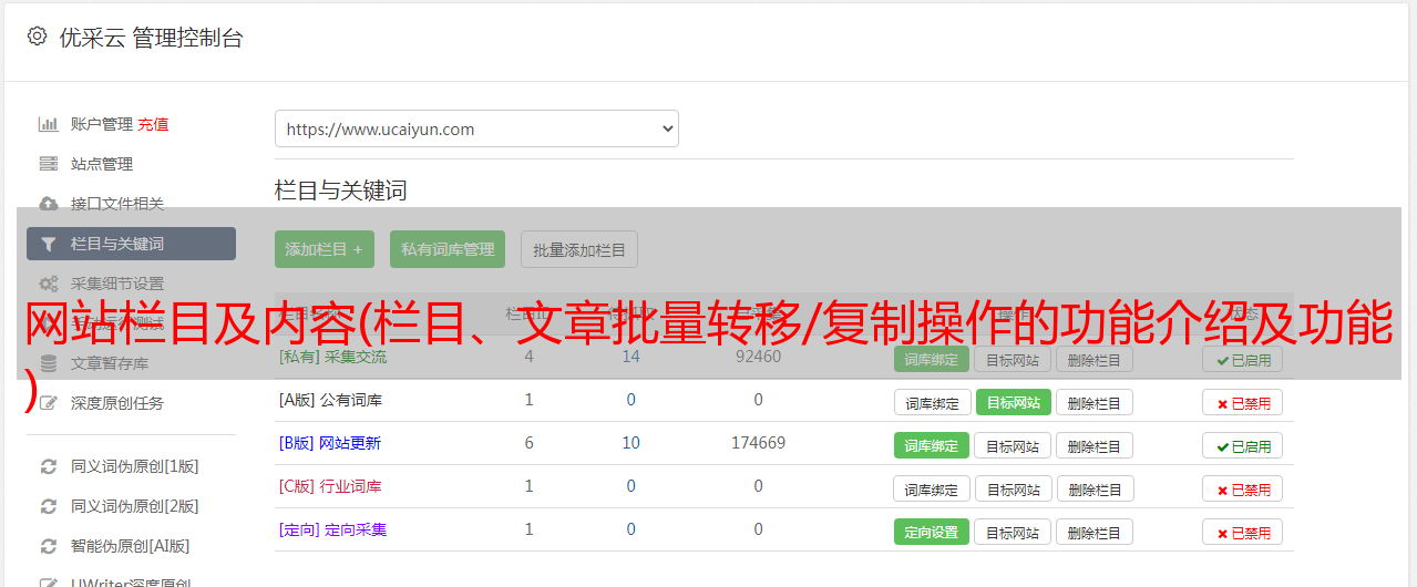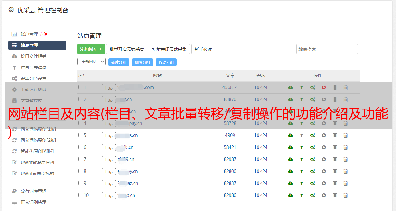 优采云 发布时间: 2022-01-25 13:12网站栏目及内容(栏目、文章批量转移/复制操作的功能介绍及功能