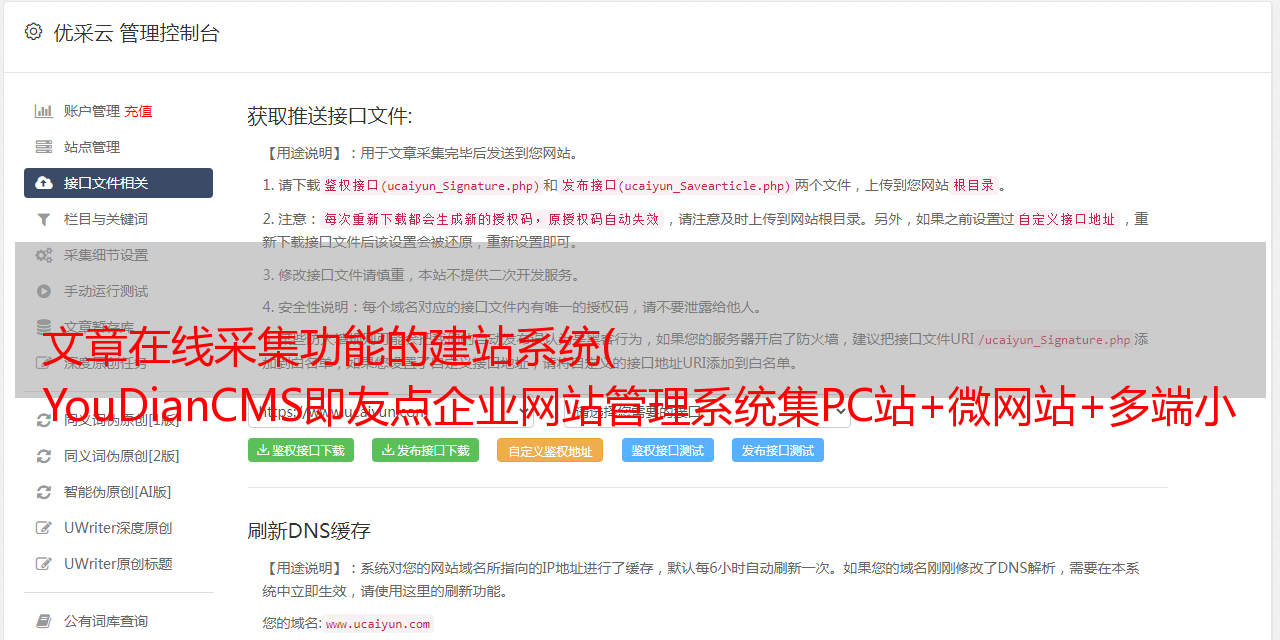 文章在线采集功能的建站系统( YouDianCMS即友点企业网站管理系统集PC站+微网站+多端小程序)