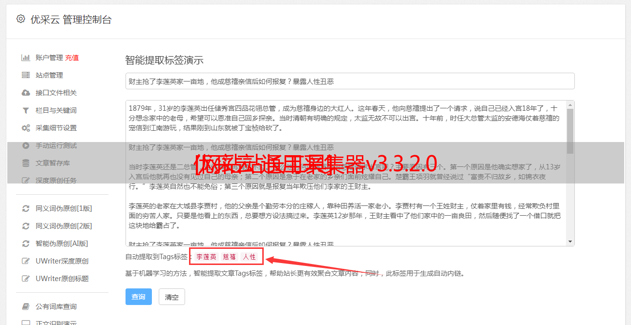 优采云软件的独家智能算法可以准确地提取网页的文本部分并将其另存为文章.