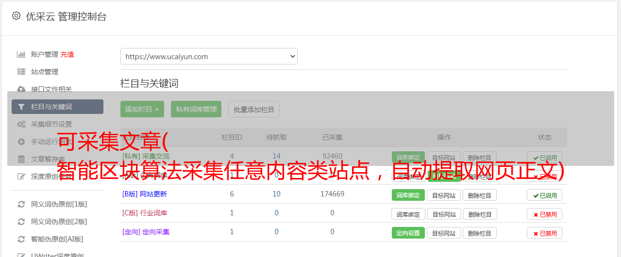Dedecms采集面向有兴趣建设伪原创7@>的站长,为了更好的管理伪原创7@>用户,增加伪原创7@>的伪原创0@>和权重,要丰富伪原创7@>的内容,频率比较高。这样就需要用到Dedecms采集到采集需要的文章资源。智能分块算法采集任意内容站点,自动提取网页正文内容,无需配置源码规则,真正做到傻瓜式采集。自动去噪,自动过滤标题内容和*敏*感*词*,多任务(多站点/列)多线程同步采集,代理采集,快速高效。指定任何 文章内容类伪原创7@>采集,而不是 <