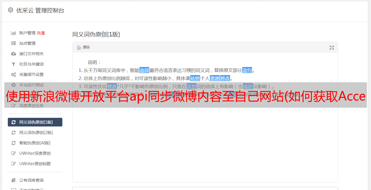 优采云 发布时间: 2022-02-01 17:18使用新浪微博开放平台api同步微博内容至自己网站(如何获取AccessToken以及如何使用新浪微博API的使用方式)
