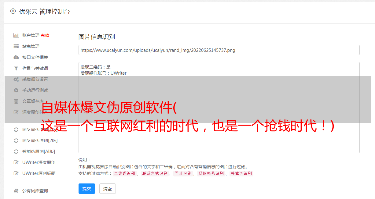 这个网站可以根据各个领域进行过滤和搜索。它在过滤结果的排序方面有很*敏*感*词*。这是一个非常实用的。此外,还有一些小功能,如伪原创和视频分析。唯一不足的是微信扫码登录时总是有bug。