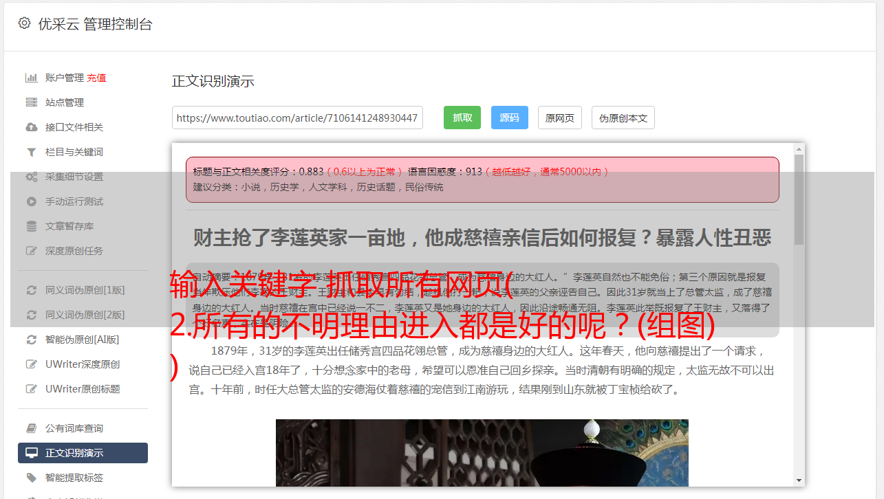 首先,知名搜索引擎提供了一个对外开放的API(Application Programming Interface),方便第三方应用获取搜索引擎数据,包括指定关键词的排名和连接目的信息,网站@ >分析系统可以通过API将这部分数据引入分析表,与网站分析的数据进行整合,为客户提供更全面的数据支持。