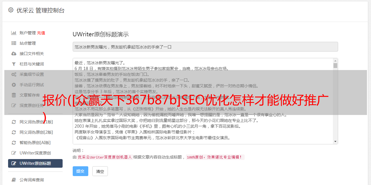 优采云 发布时间: 2022-02-04 19:06报价([众赢天下367b87b]SEO优化怎样才能做好推广