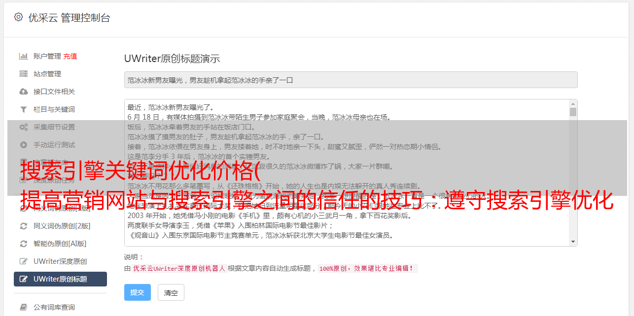 优化操作,避免作弊。很多公司为了走捷径,去网上找排名关键词的公司或软件,各种刷子可能当时首页都是关键词,只要百度更新一下, 关键词 将被删除。超越前100,或者直接去K站,当然有很多不合法的方法,不要尝试。