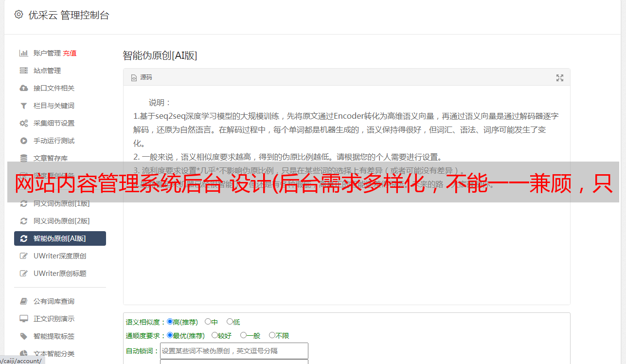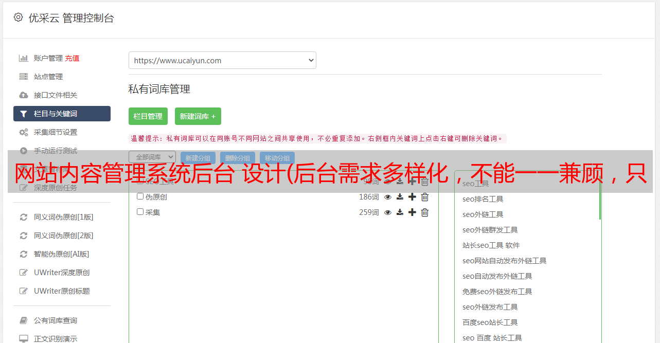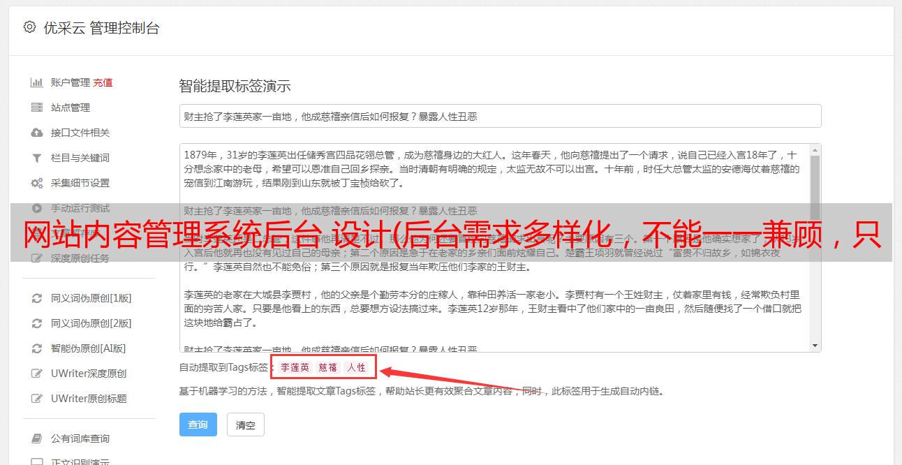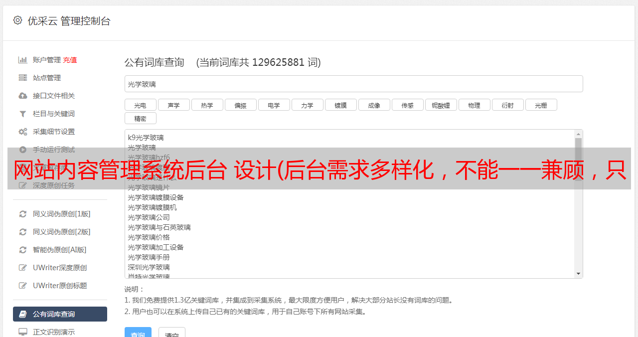优采云 发布时间: 2022-02-09 15:21网站内容管理系统后台 设计(后台需求多样化,不能一一兼顾,只能蜻蜓点水,尽量深入浅出