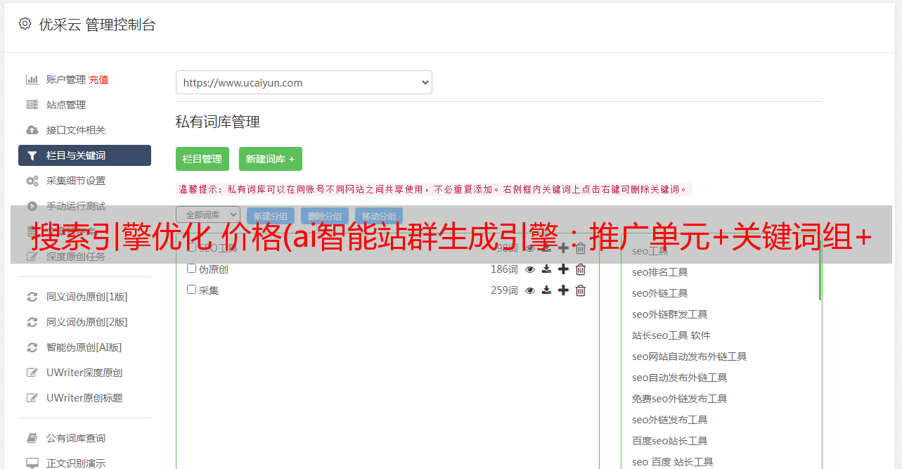 优采云 发布时间: 2022-02-10 08:02搜索引擎优化 价格(ai智能站群生成引擎:推广单元+关键词组+关键词)