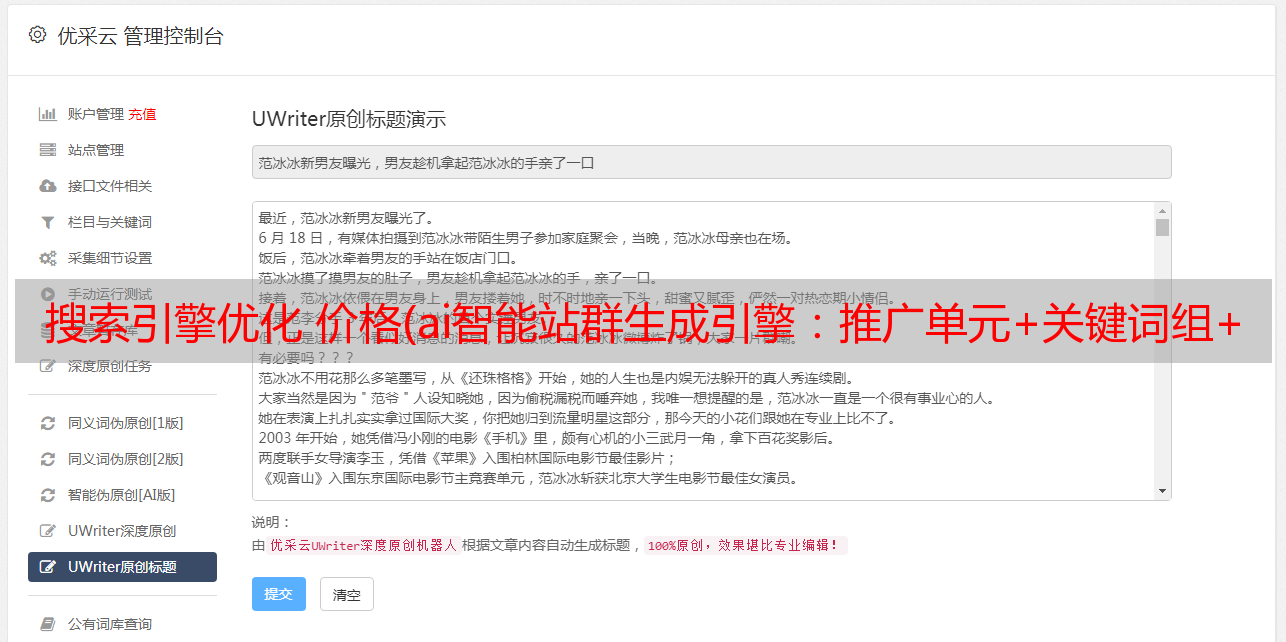 ai智能站群生成引擎:推广单元+关键词群组+关键词,智能设置推广策略;关键词+图片+素材内容,自动优化组合;根据人工智能引擎策略,自动生成产品推广信息。