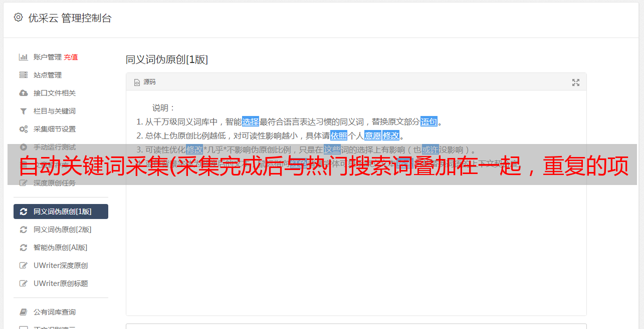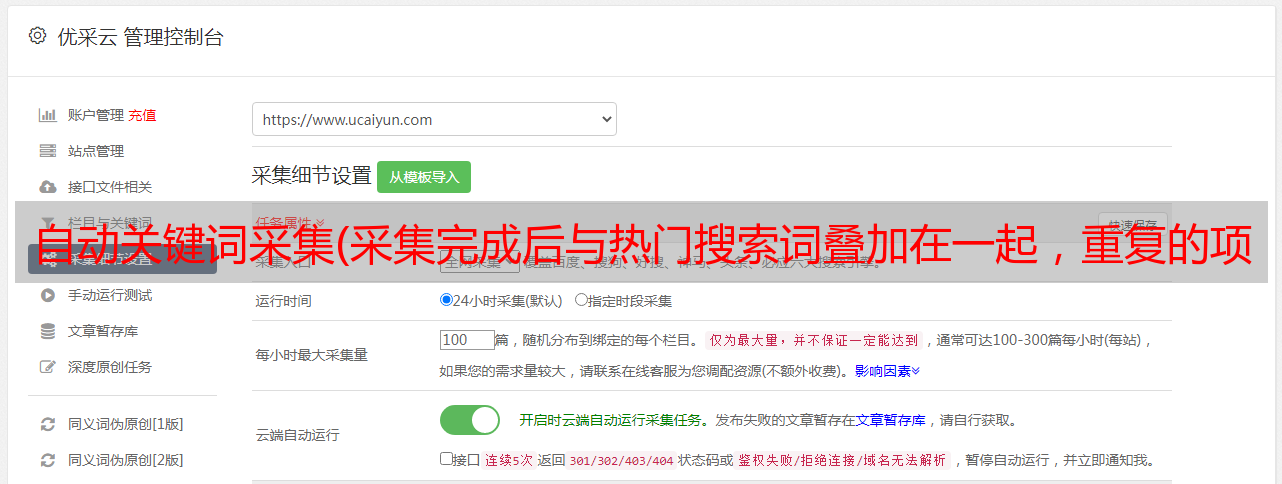 自动关键词采集(采集完成后与热门搜索词叠加在一起,重复的项目系统会自动删除)