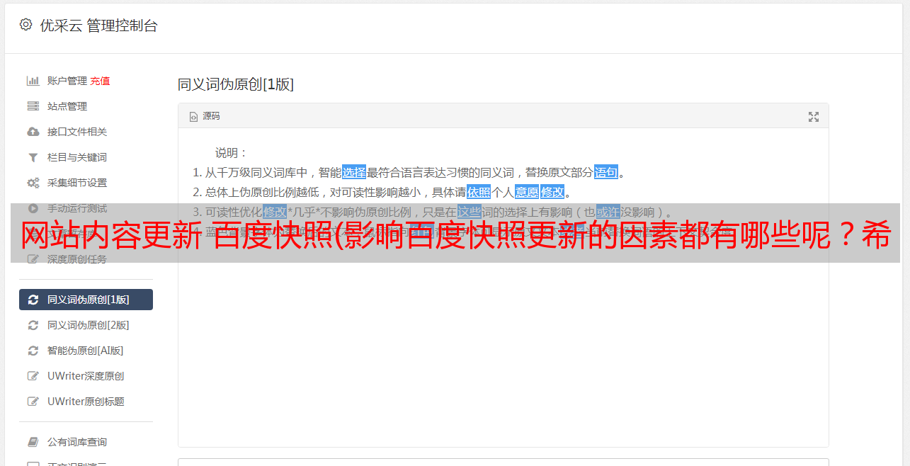 现在很多网站的内容都是伪原创,找一些原创文章来修改。随着时间的推移,百度快照的更新速度会越来越慢。