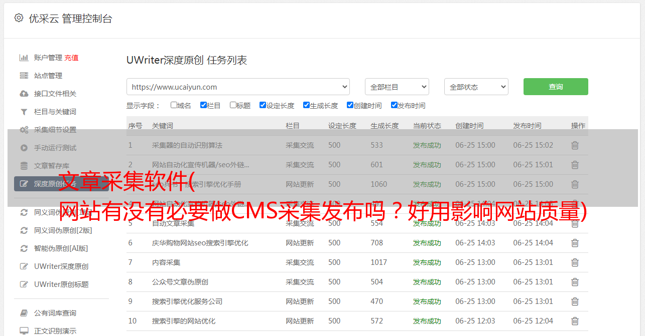 例如,公司有 100 个 网站,所有这些都由 SEO 优化器维护和优化。网站类型有 Empirecms、WordPress、织梦、ThinkPHP 等。如果使用优采云采集发布这样的工具,首先每个站需要大量的采集文章,针对不同的cms发布,这样日常的工作就是检查是否所有的站采集都已经发布了。不说复杂的配置过程,还要分心观察发布是否成功。耗费大量人力财力,效率极低!