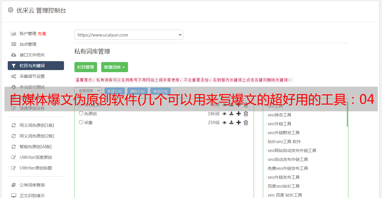 另外,这个网站可以满足自媒体从业者的基本需求。在网站的常用工具中,可以看到伪原创工具、关键词搜索、爆文标题、原创度数检测和编辑器等都非常好用,也很方便。