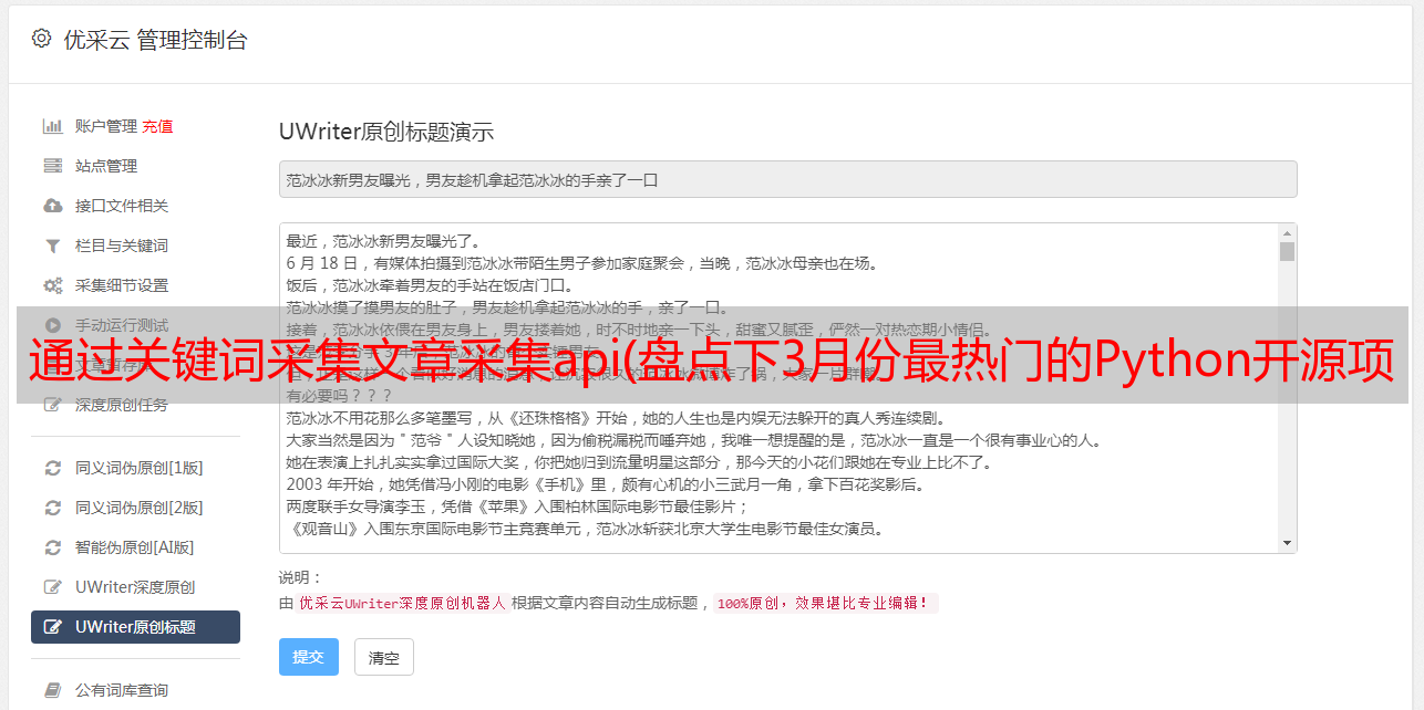 优采云 发布时间: 2022-02-25 03:15通过关键词采集文章采集api(盘点下3月份最热门的Python开源项目(组图))