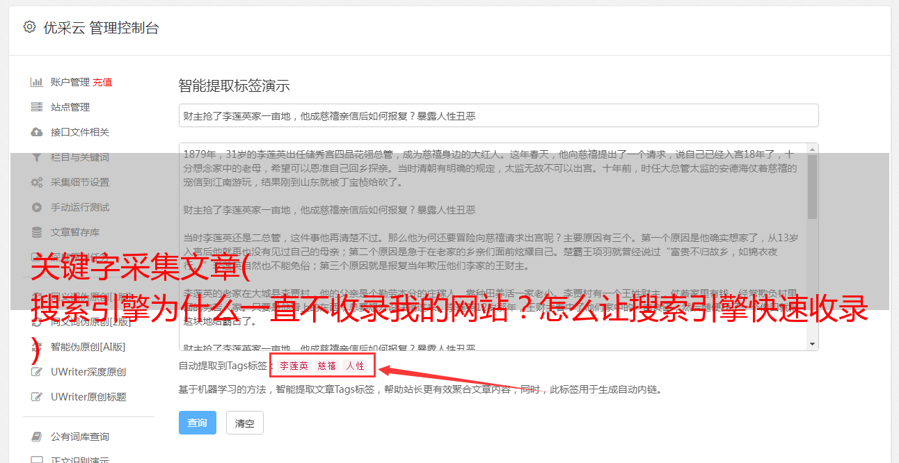 采集的内容一定要对应标题,要做到页面相关,一定要垂直,采集行业文章和关键词,切记,不要乱来采集文章,填写数字,然后必须公布大量的文章采集。做好,像往常一样定期发布,让搜索引擎知道你的模式,逐渐增加或减少。偶尔可以穿插一两篇原创文章的文章,更有利于收录和网站的排名。