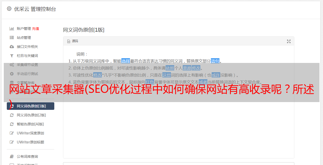 <p>文章采集器 SEO功能全面,支持市面上大部分cms,支持标题和内容插入关键词,替代图片本地化,支持实时监控