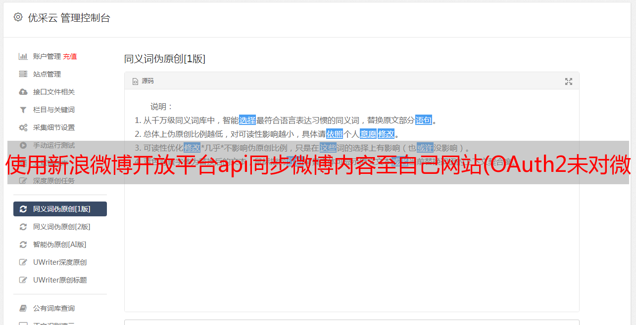 优采云 发布时间: 2022-02-27 22:05使用新浪微博开放平台api同步微博内容至自己网站(OAuth2未对微博的access_token导致任意用户登陆这个问题)