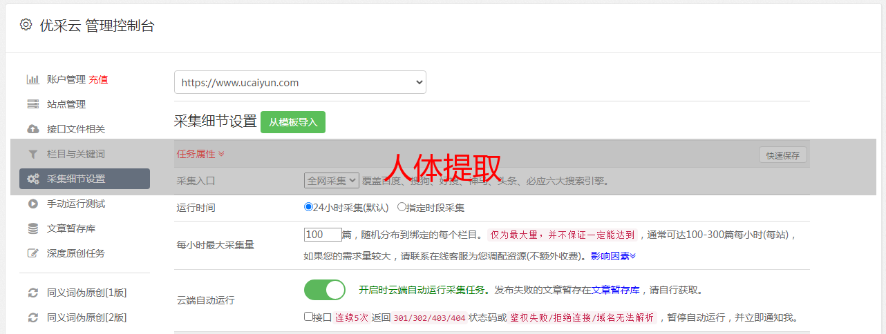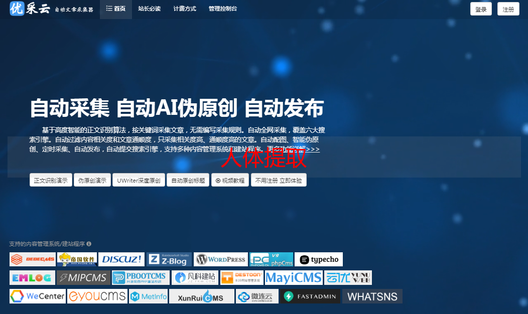 优采云 发布时间: 2020-08-06 09:04网页内容正文提取,可以提取Internet上99%以上的文章内容,并智能识别其中收录的标题和正文内容. Internet上有近千万个站点,每个站点还具有N个不同的文章页面模板. 您只需要访问我们的界面,就不必担心编写文章内容采集规则. 您可以直接提取标题和密钥. 文字,摘要,正文.