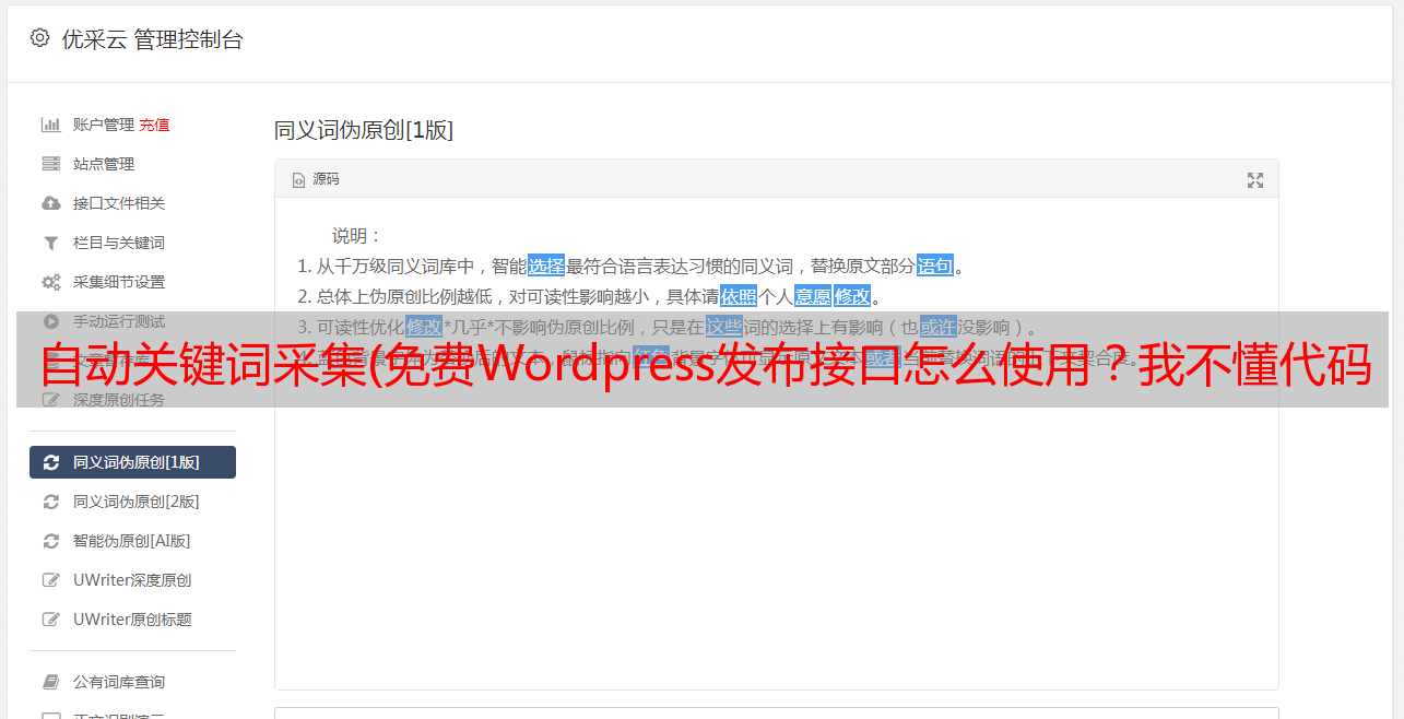 优采云 发布时间: 2022-03-03 12:07自动关键词采集(免费Wordpress发布接口怎么使用?我不懂代码多久可以学会啊?