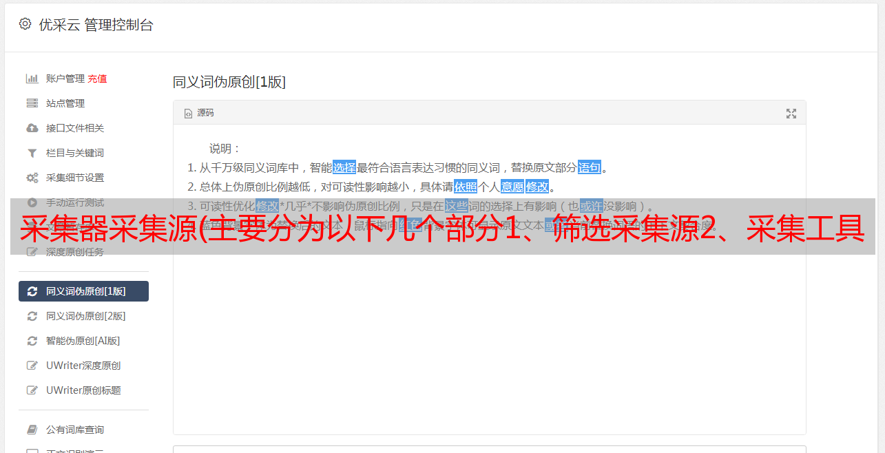 现在几乎所有主流的采集工具都提供了,智能的原创api接口,可以直接调用5118等伪原创内容接口。当然还有其他平台,大家可以自己选择,这种API是付费的,费用自查。