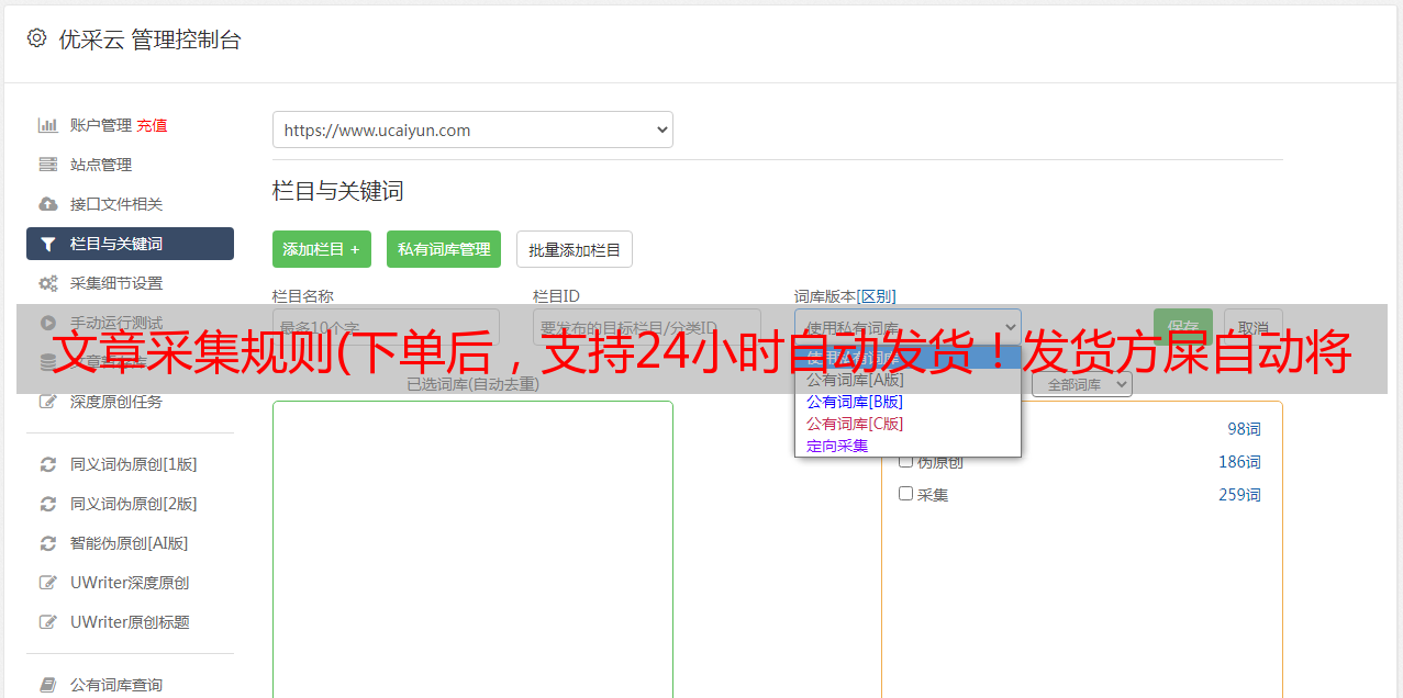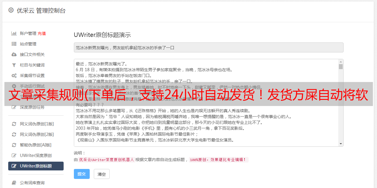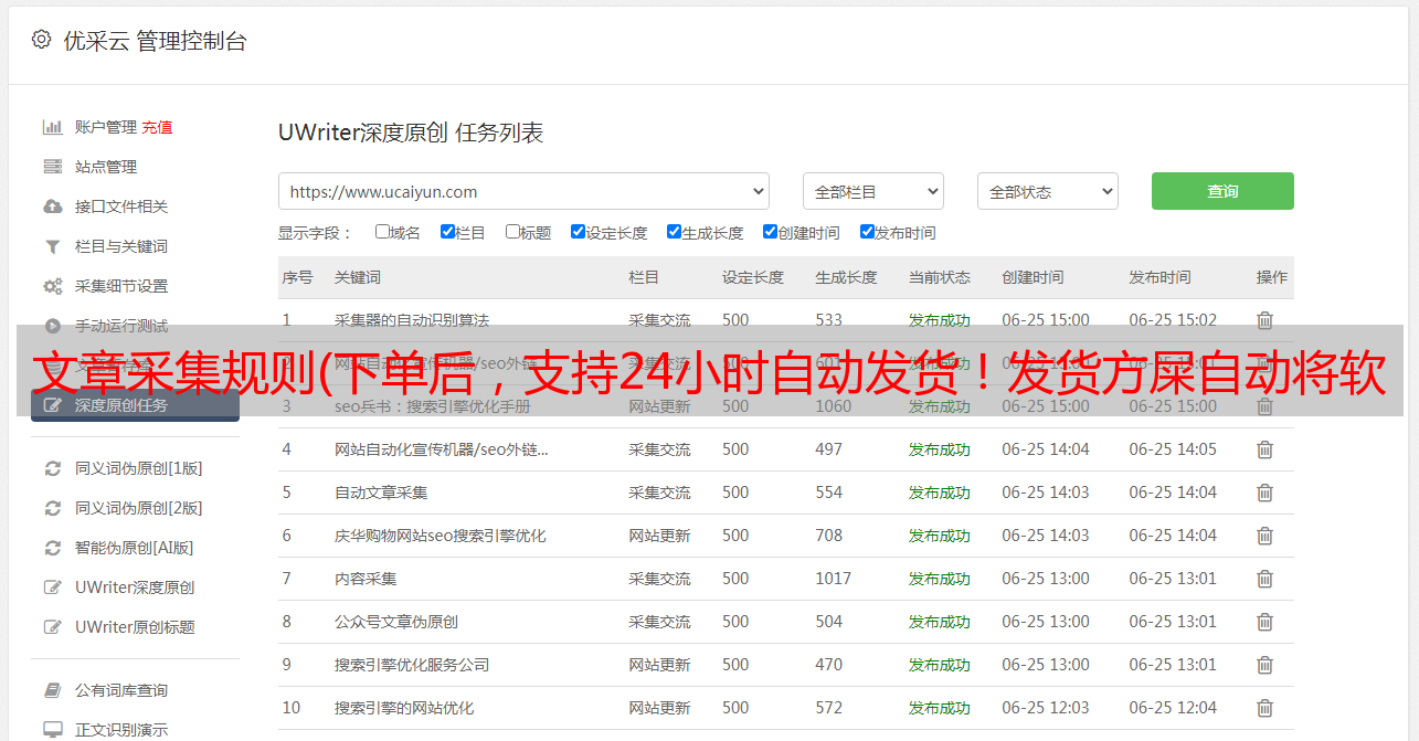 优采云 发布时间: 2022-03-04 00:16文章采集规则(下单后,支持24小时自动发货!发货方屎自动将软件信息)