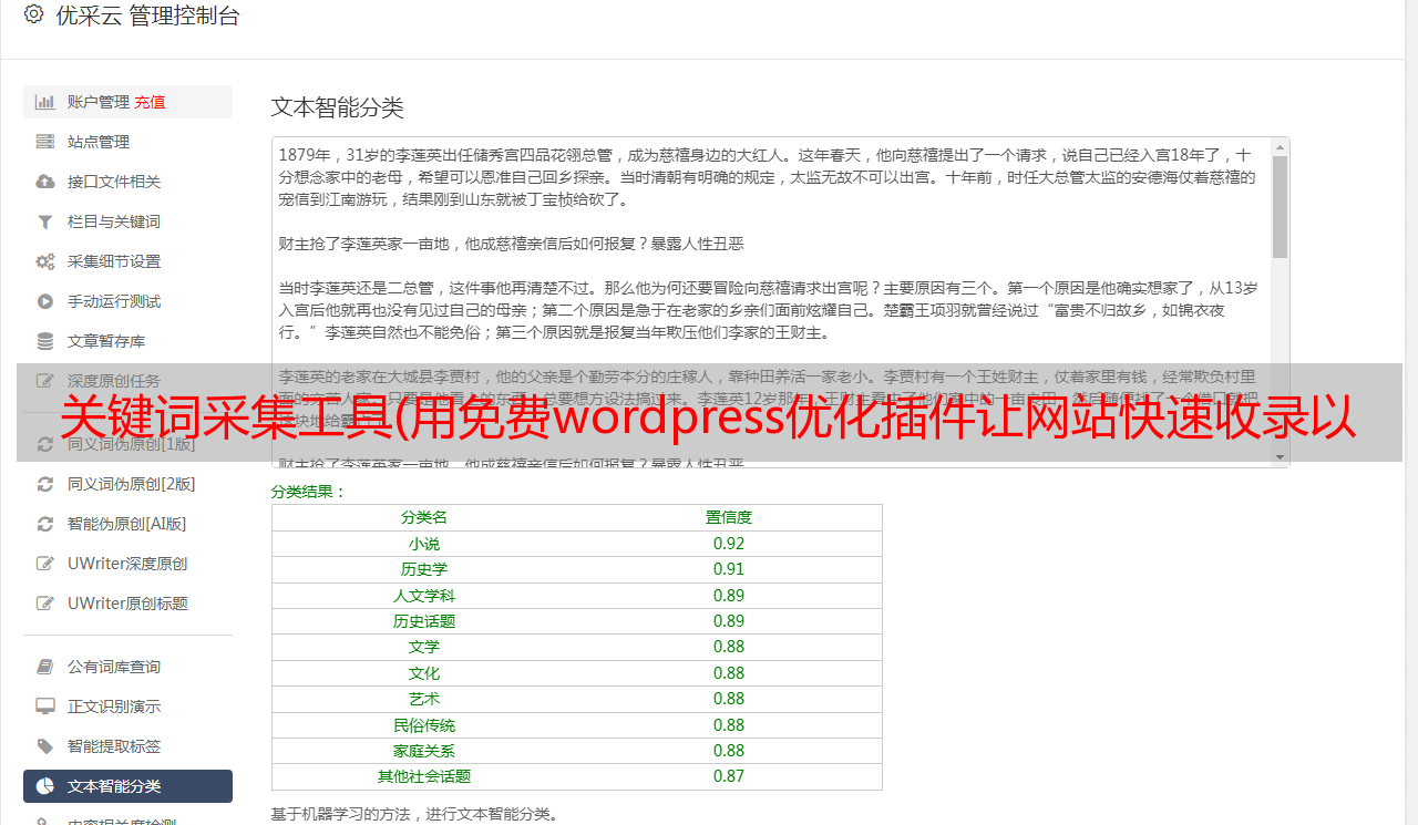 相比其他wordpress优化插件,这个wordpress优化插件基本没有规则,更别说花很多时间学习正则表达式或者html标签,一分钟就能上手,直接输入关键词即可实现采集(wordpress 优化插件还带有 关键词采集 功能)。全程自动挂机!设置任务,自动执行采集伪原创发布并主动推送到搜索引擎。