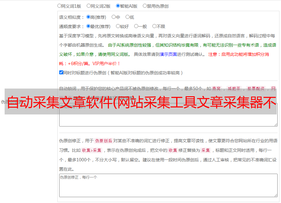 1、按 关键词采集文章 而不写 采集 规则。自动全网采集,覆盖六大搜索引擎。自动过滤内容相关度和文章平滑度,只有采集高度相关和平滑度文章。图片自动匹配,智能伪原创,定时采集,自动发布,自动提交到搜索引擎,支持各种cms和站群程序。采集任务每天定时定量完成!您只需要设置必要的参数即可实现高质量的全托管无人值守自动更新文章。