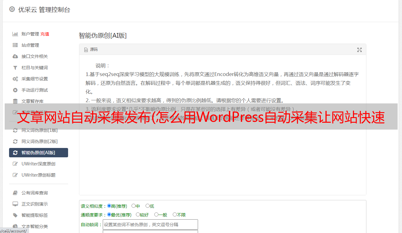 优采云 发布时间: 2022-03-06 15:21文章网站自动采集发布(怎么用WordPress自动采集让网站快速收录以及关键词排名,整体流程