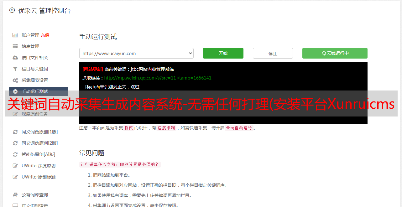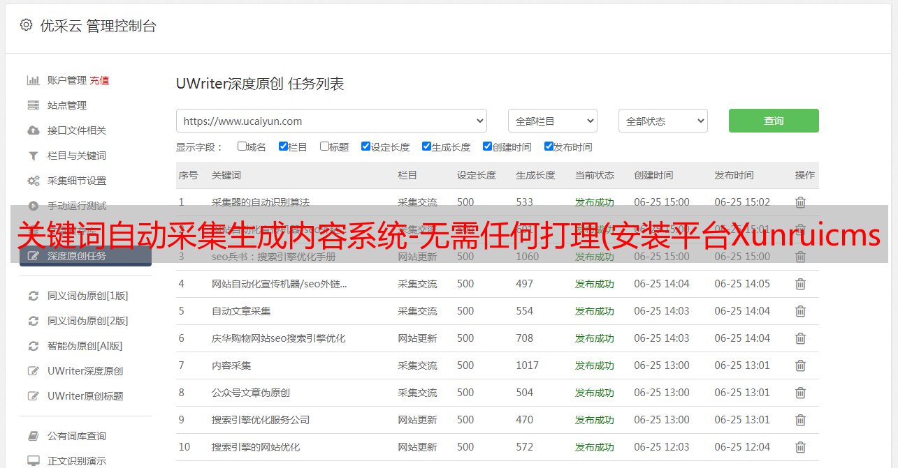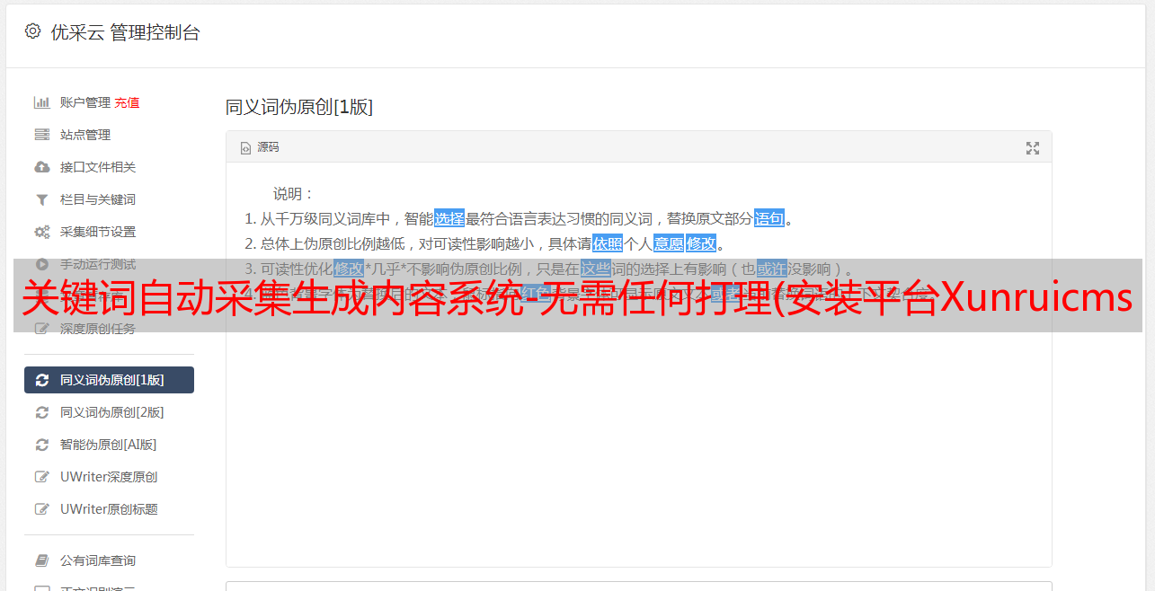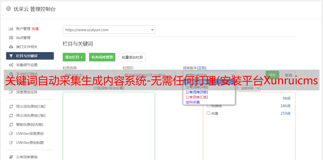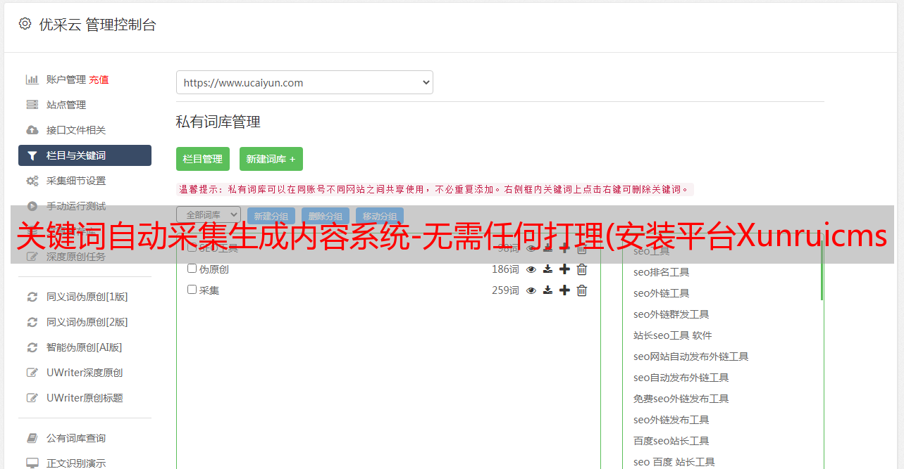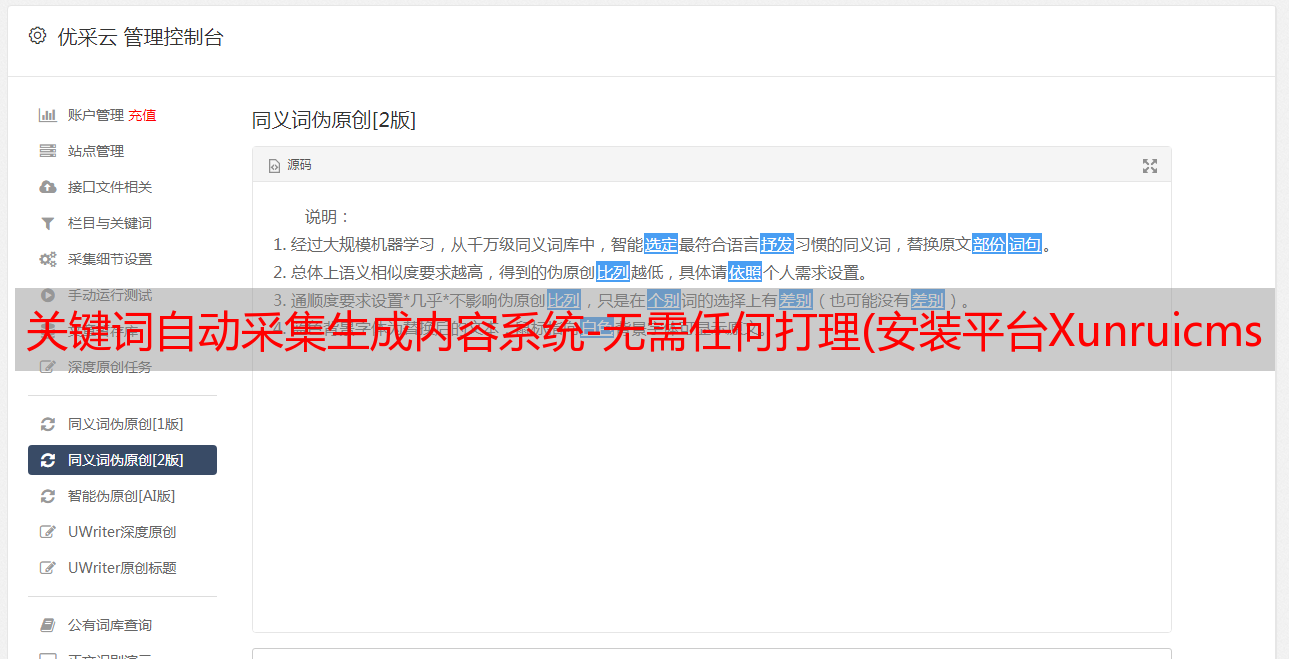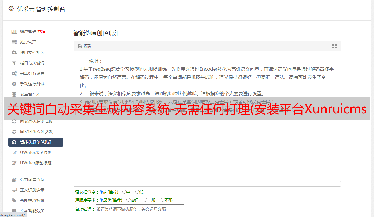 关键词自动采集生成内容系统-无需任何打理(安装平台Xunruicms功能类别内容增强采集开源协议源码加密未加密技术保障 )