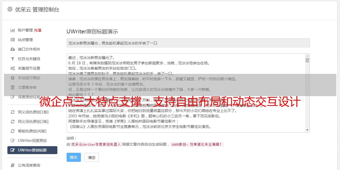 此外,当前的网站设计正变得越来越复杂,并且动态交互也越来越多,尤其是在HTML5技术(缩写为H 5))出现之后,图片和文本的组合已无法满足在此基础上,Micro Enterprise Point不仅专注于免费布局可视化网站设计工具,而且最近还推出了一项新功能:动态交互设计,该功能充分利用了H5网站构建技术的潜力。