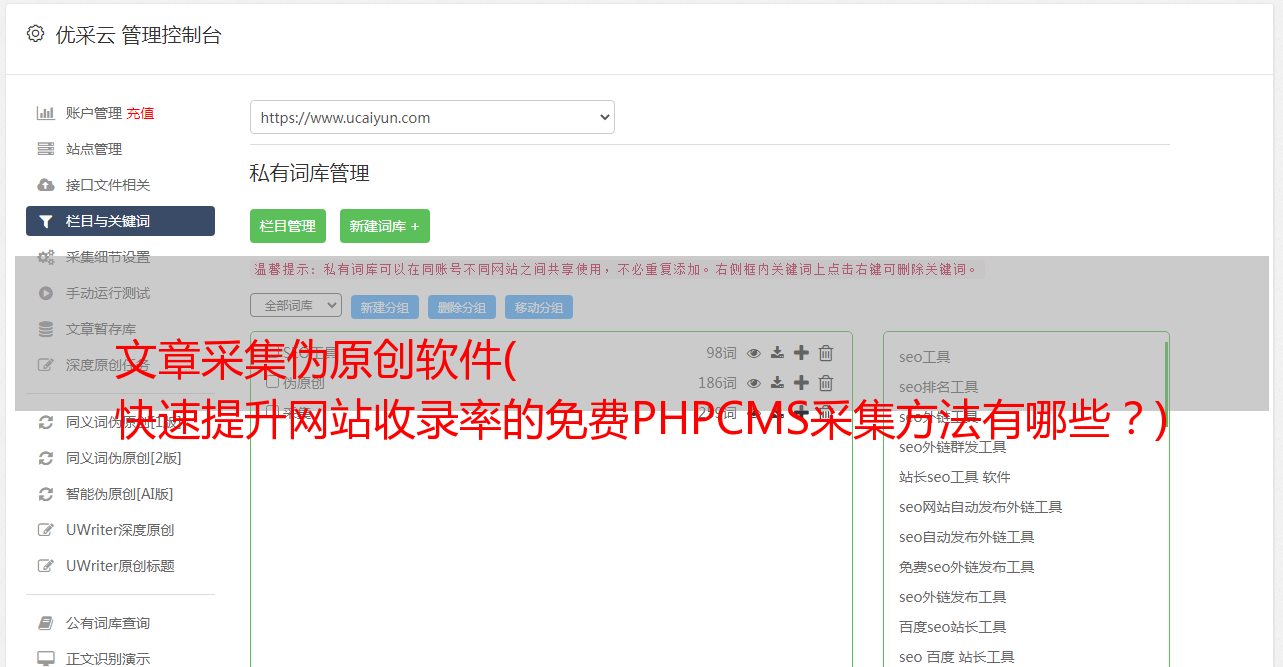 免费PHPcms采集,一站式网站文章采集,原创,发布工具,快速改进网站 收录,排名,权重,帮助站长维护网站内容,批量管理网站。我想快速提高网站收录的速度,但是我没有那么多经验和精力,怎么办?可以使用工具来完成网站的日常内容采集的填写和发布管理,可以大大提高网站百度收录的上架率。完美连接PHPcms,网站只要用PHP构建cms,网站无需修改任何代码,即可实现一键式文章采集 原创发布,创建发布任务,无需人工干预,每天智能发布文章,大大增加网站百度收录的音量,网站优化更厉害。小编通过PHPcms建立了一些网站,带有PHPcms采集伪原创发布功能,再加上SEO优化,效果还是不错的, 收录数量相当客观。