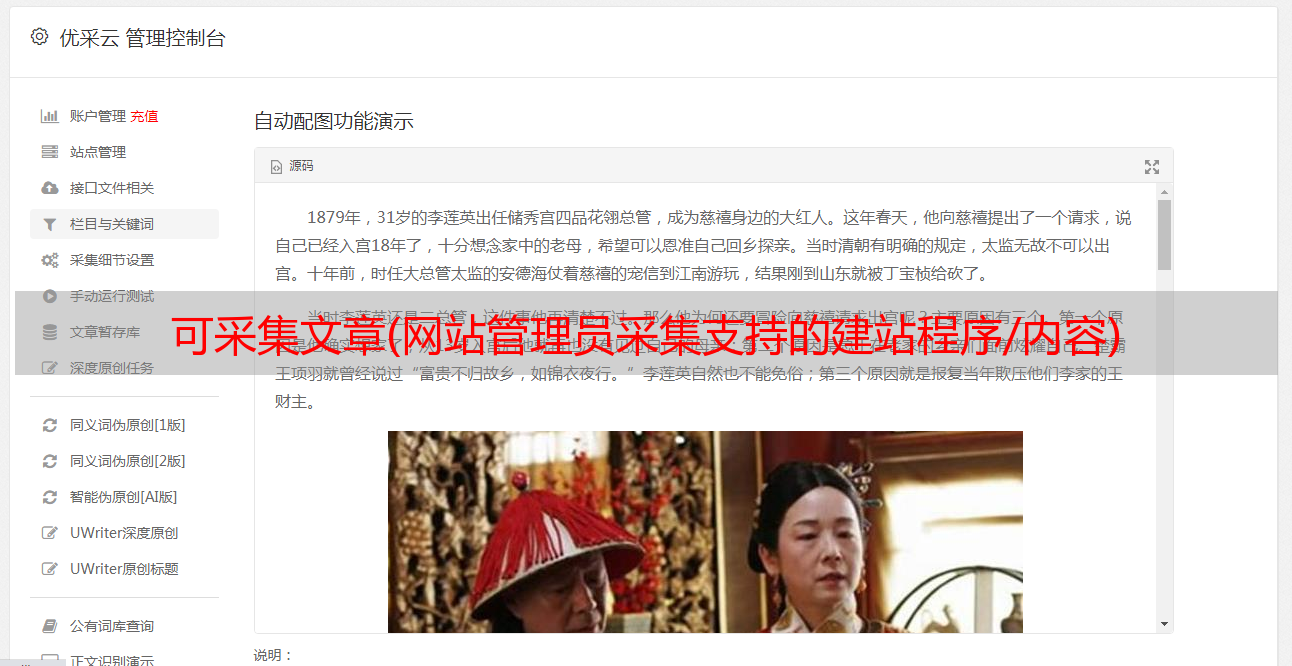 优采云采集自动提取Tags标签,并在此基础上实现自动内链。当该标签对应的文本出现在文本中时,优采云采集在文本中添加站点上的一个文章链接指向一篇同主题的文章文章,实现自动化、科学、有效的内链构建。您也可以设置固定链接。当文本中出现一些固定文本时,为其添加一个固定链接,该链接可以指向站点内部或外部的文章。优采云采集根据文章的内容自动匹配图片,这样即使是采集的文章也可以有图有文。