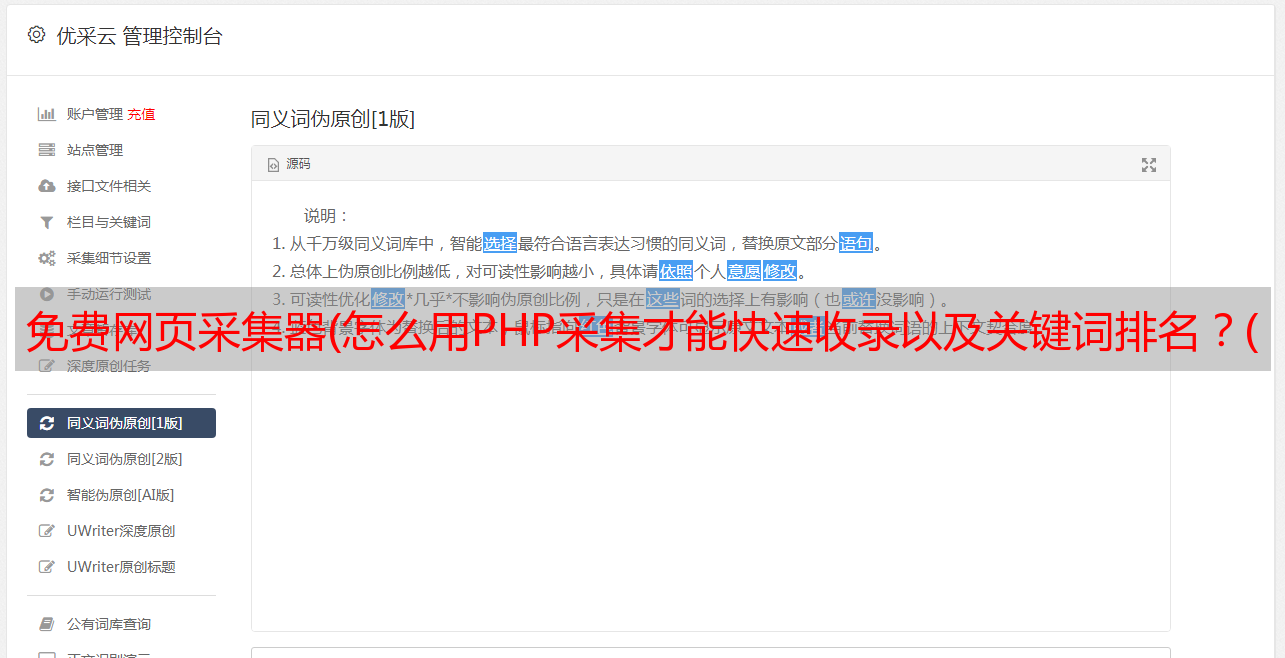 不管你有成百上千个不同的cms网站都可以实现统一管理。一个人维护数百个 网站文章 更新也不是问题。这个PHP采集还配备了很多SEO功能,通过采集伪原创软件发布后还可以提升很多SEO方面。