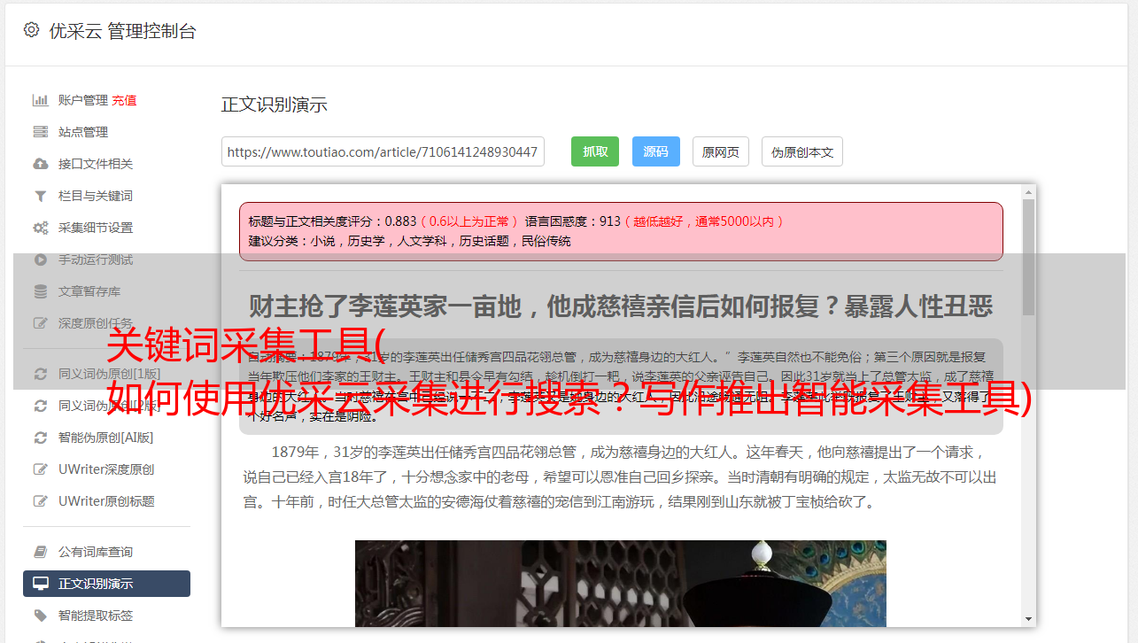 优采云采集是自媒体素材搜索、文章原创、一键发布的操作工具,有效提升新媒体运营效率,降低企业成本。